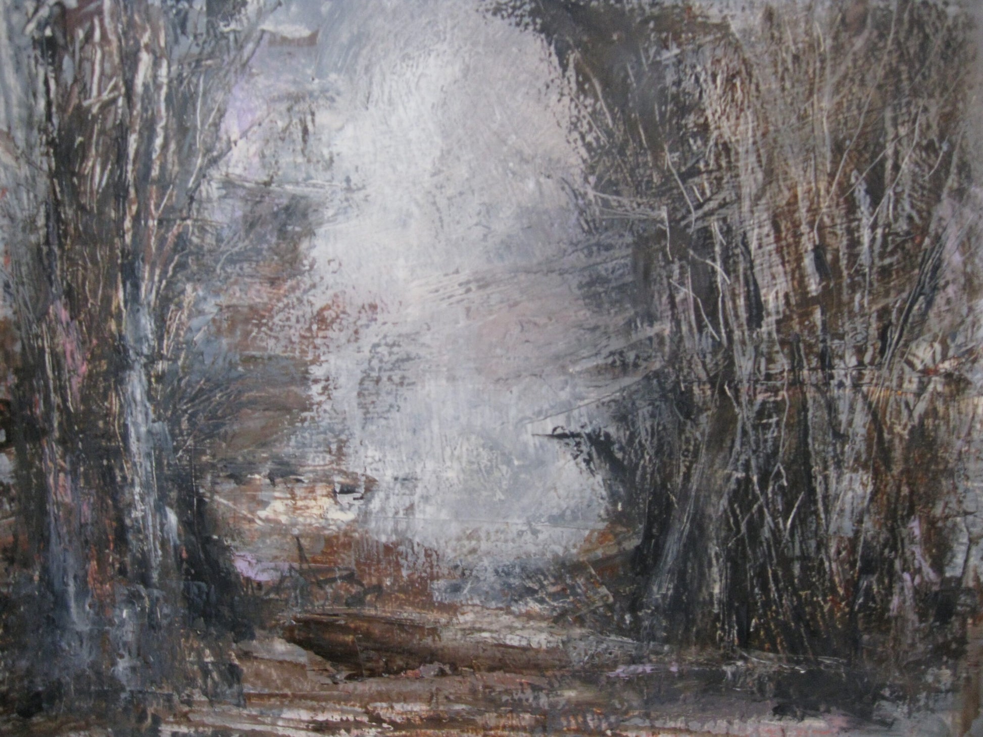 This painting was done in my studio with the intention of creating a scene of a gray, dreary day in the woods.