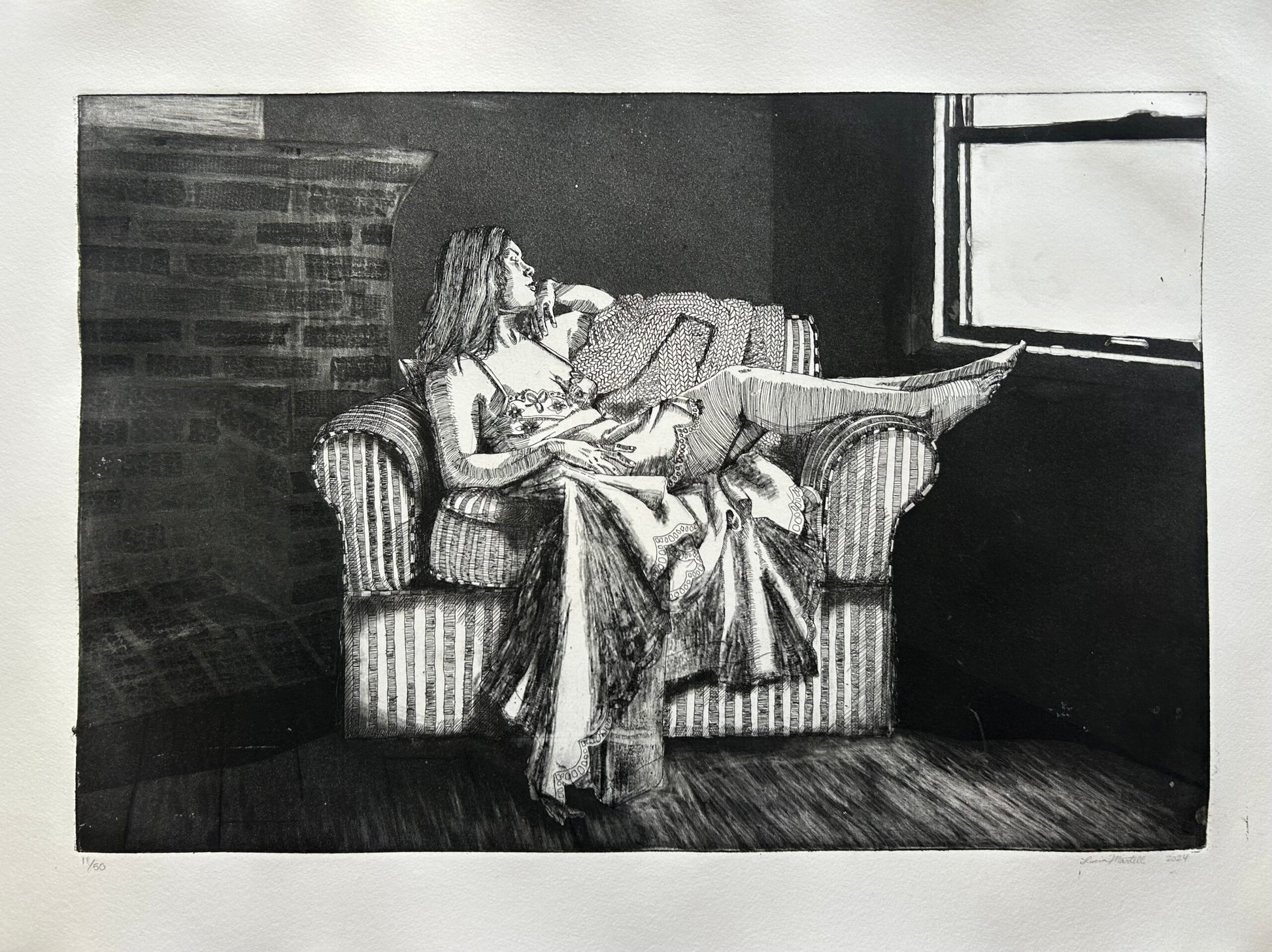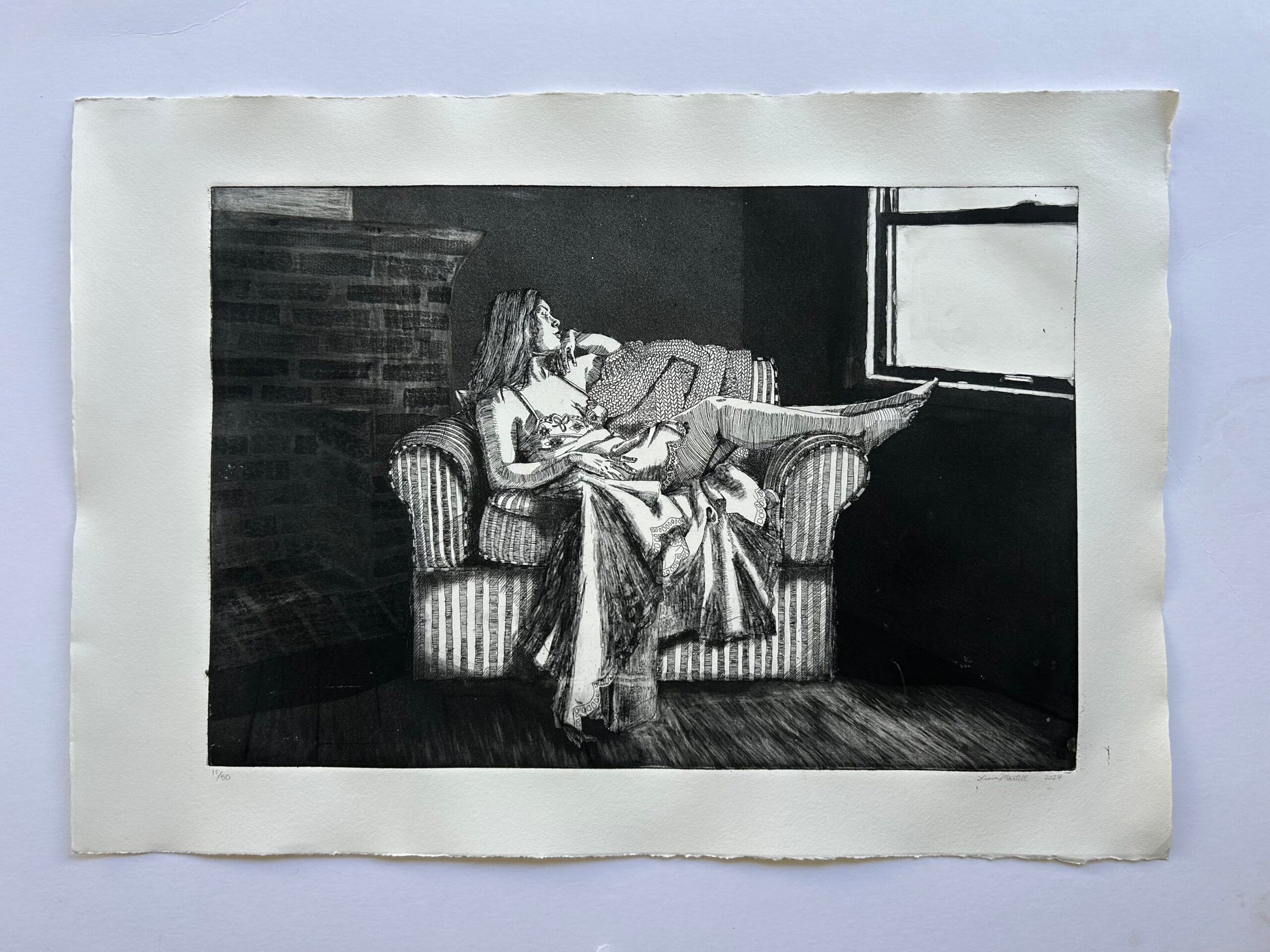 While much of the figure is a hardground etching on a zinc plate, there is also a lot of burnishing and aquatint methods to achieve the textures in the walls and floors. A separate collagraph plate using cut-up pieces of fabric glued to cardboard created the texture in the fireplace to the left of the piece.