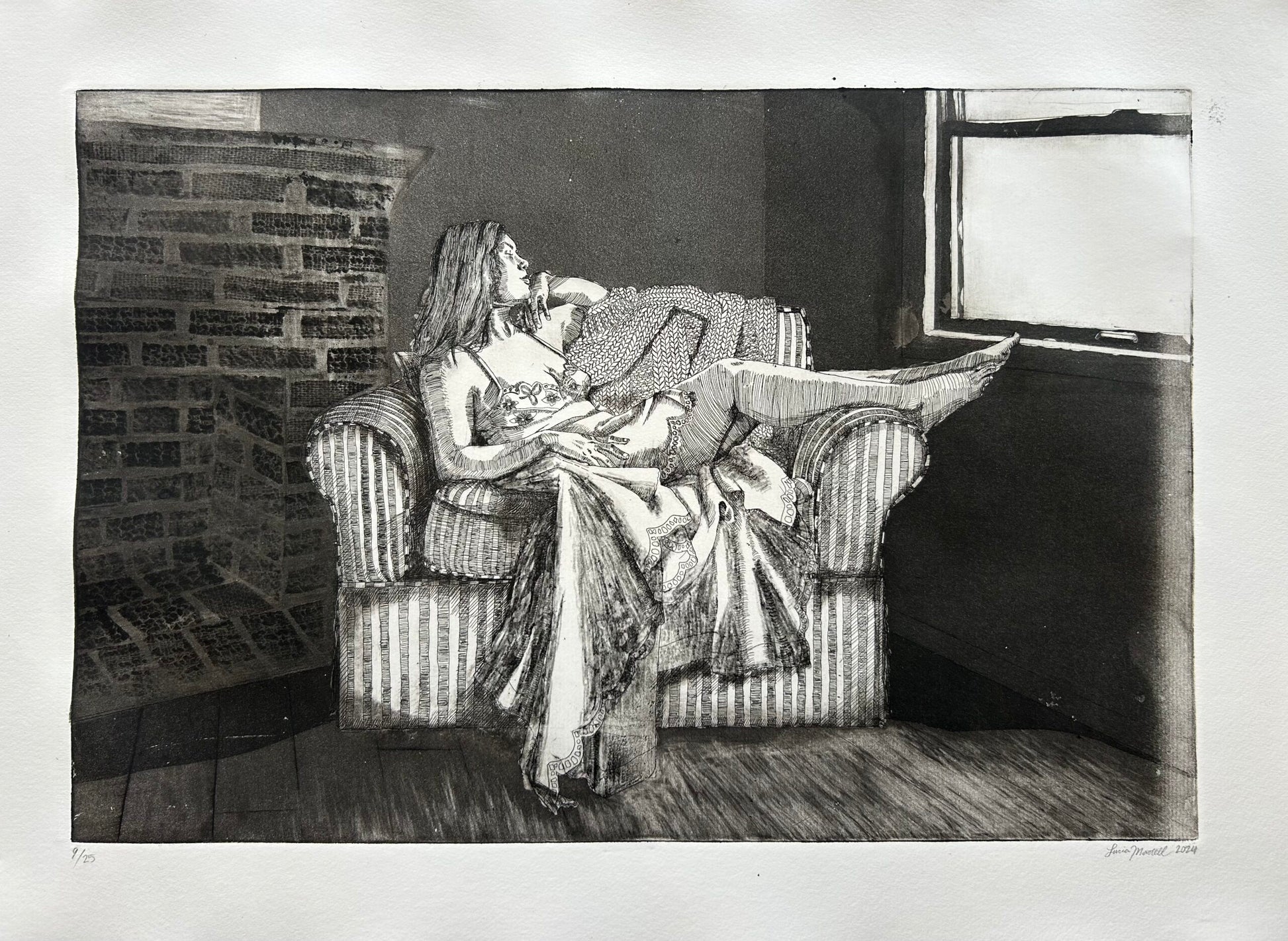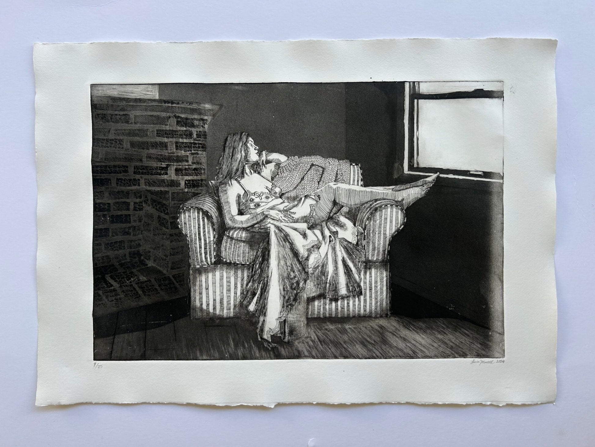 While much of the figure is a hardground etching on a zinc plate, there is also a lot of burnishing and aquatint methods to achieve the textures in the walls and floors. A separate collagraph plate using cut-up pieces of fabric glued to cardboard created the texture in the fireplace to the left of the piece.