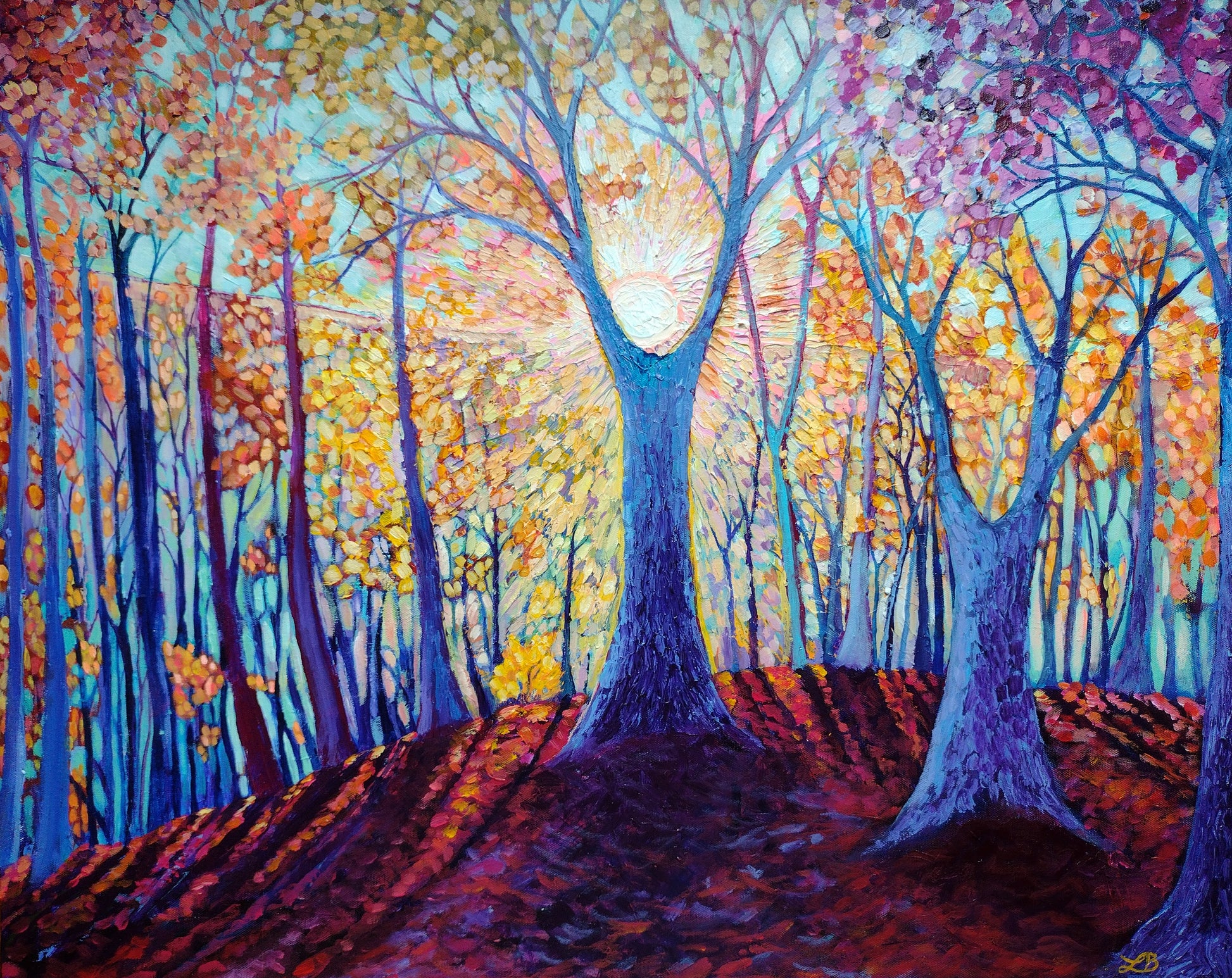 Waking up early and watching the sun rise through the oaks at my home is one of my favorite joys. This painting has a stained-glass quality to it. Dappled in jewel tones, it will liven up any space
