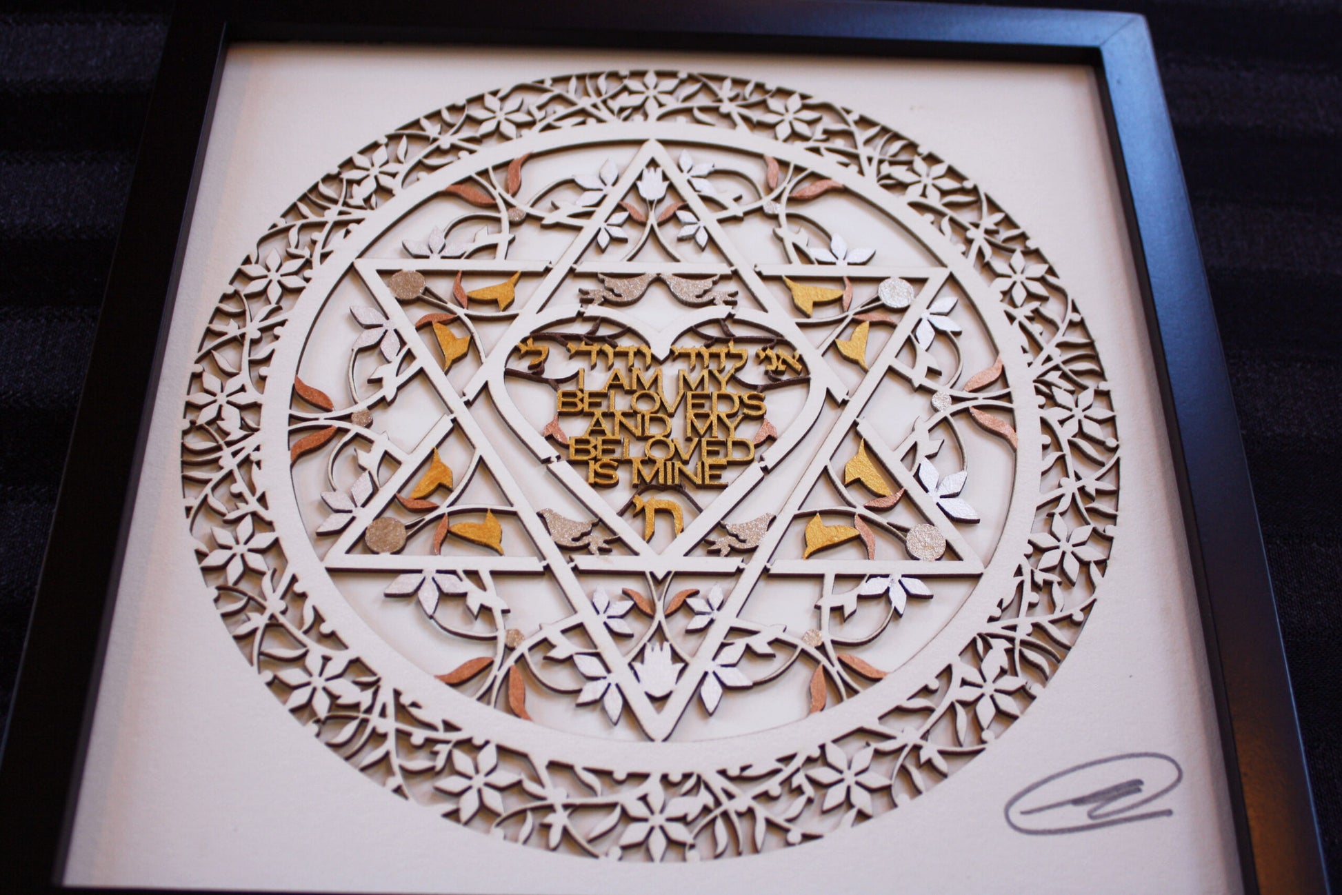 Translates to "I am my beloved's, and my beloved is mine". This is one of the most well-known quotes from the "The Song of Songs", written by King Solomon. It is in the form of a beautiful, romantic declaration between two loving people. The intertwining beauty of love is captured in this beautiful piece integrating the Hebrew phrase with its English translation, all housed within a heart and a Star of David.
