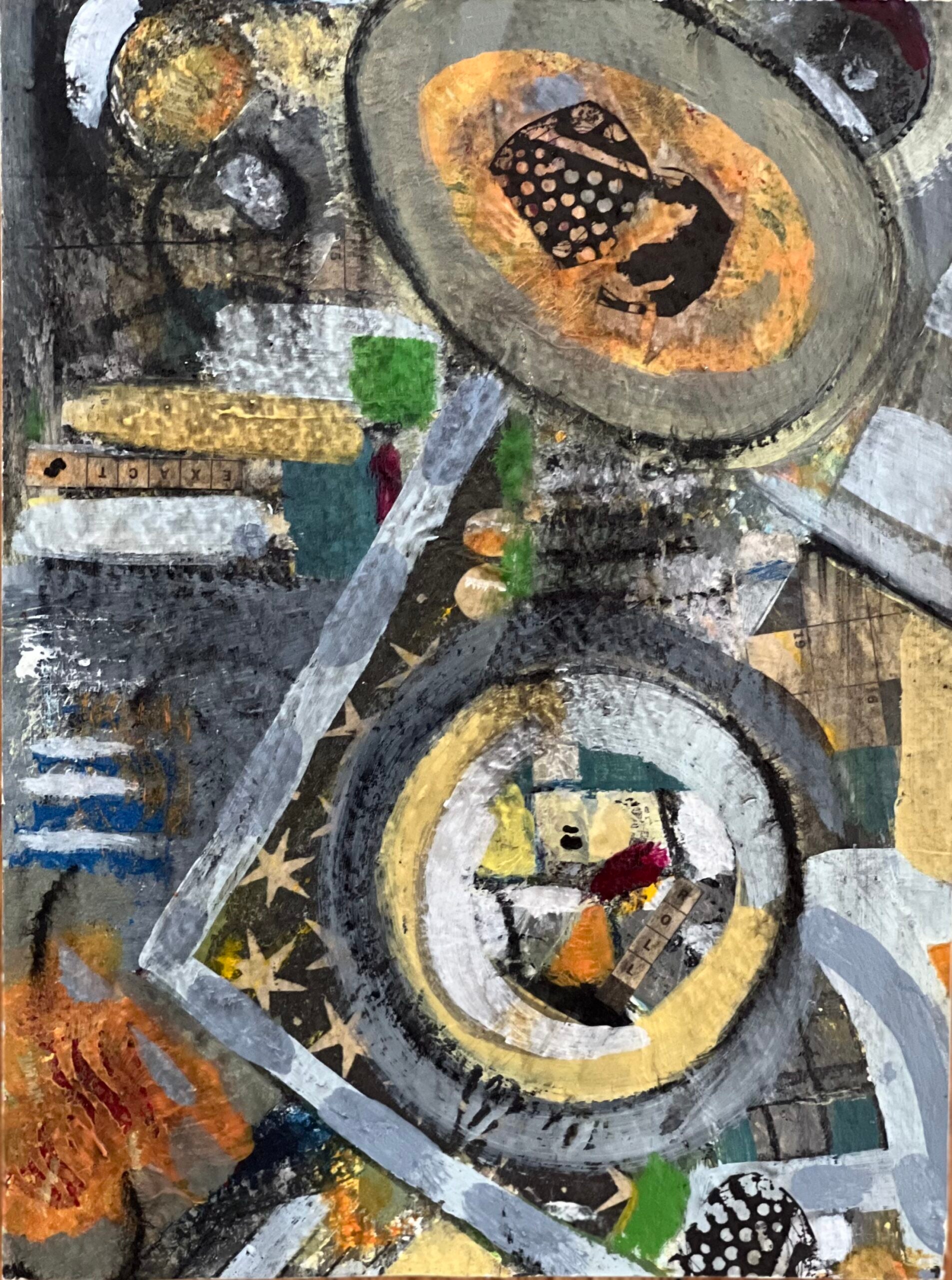 multiple shapes drawn with a soft crayon. More layers are created using papers, fabric, numbers or letters as well as painted images from stencils. This is finished by more paint and colored pencils.