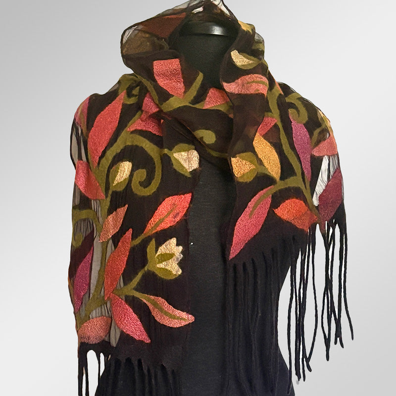 A lightweight nuno felt scarf on a black silk gauze base.The design incorporates elegant swirling patterns and floral designs. The scarf is finished with long, elegant fringes and drapes beautifully.