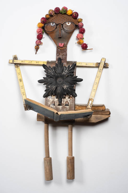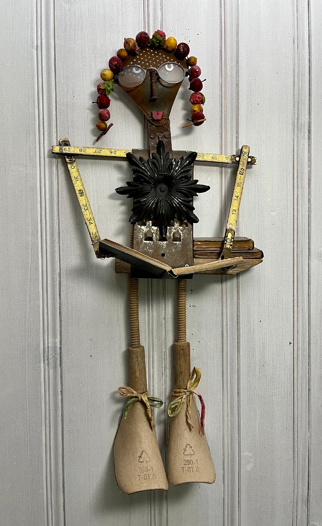 Babs comes with or without the feet which are cardboard shoe inserts. Her legs are a wooden worm gear which supports the closed books. Her arms are a folding yardstick. Her hands holding an open book are crafted from a fireplace screen. Her head is an old strainer, her neck a metal plate and her body a grater. A decorative black metal piece is on her chest. Her hair is a string of decorative fake fruit....washers for eyes and a screw for a nose. She wears glasses.