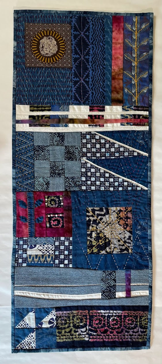 This is a long narrow quilt sewn with authentic, vintage African cloth. It is embroidered with Perle cotton. Lots to discover every time you look!