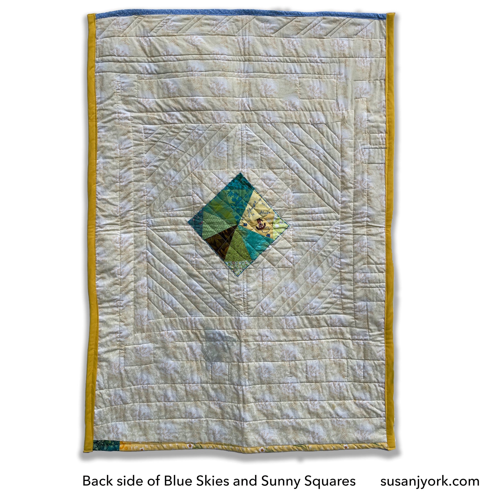 This quilt may be used as a throw, a wall hanging or crib quilt. This original quilt design focuses on a large yellow floral square with quilted in a small 2 inch squares, bordered by four pieced triangles that turn the square into a diamond which is then bordered by four a rich royal blue triangles bringing returning the shape to a square. This square is then bordered by a thin white on white floral fabric bordered by a yellow on yellow geometric fabric. The the outer border of the quilt include pieced strips for an overall pleasing design. The quilting accents the choices of fabric and can be seen in the cream backing with a hidden pieced and appliquéd green diamond center on the back side of the quilt. This quilt coordinates well with the Happy House Pillow cover/sham in separate listing.