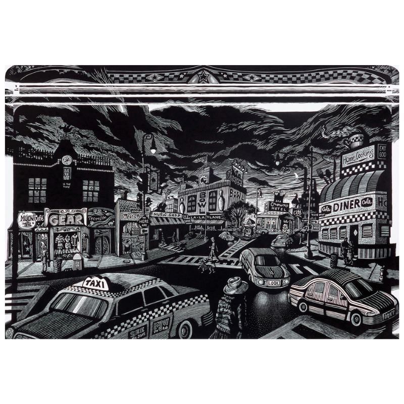 Boulevard Boogie is based on an actual city intersection as a starting point only, and then takes on a life of its own as I added shops, vehicles and characters from imagination. It feels so familiar, but although it is based on a real location, this is someplace new, with an inviting affinity for the retro. Hidden messages (of the positive persuasion) are dispersed throughout the image, on buildings, signs and vehicles, ultimately assuring the viewers that everything is going to be alright ~ and encourage them to live in the moment.