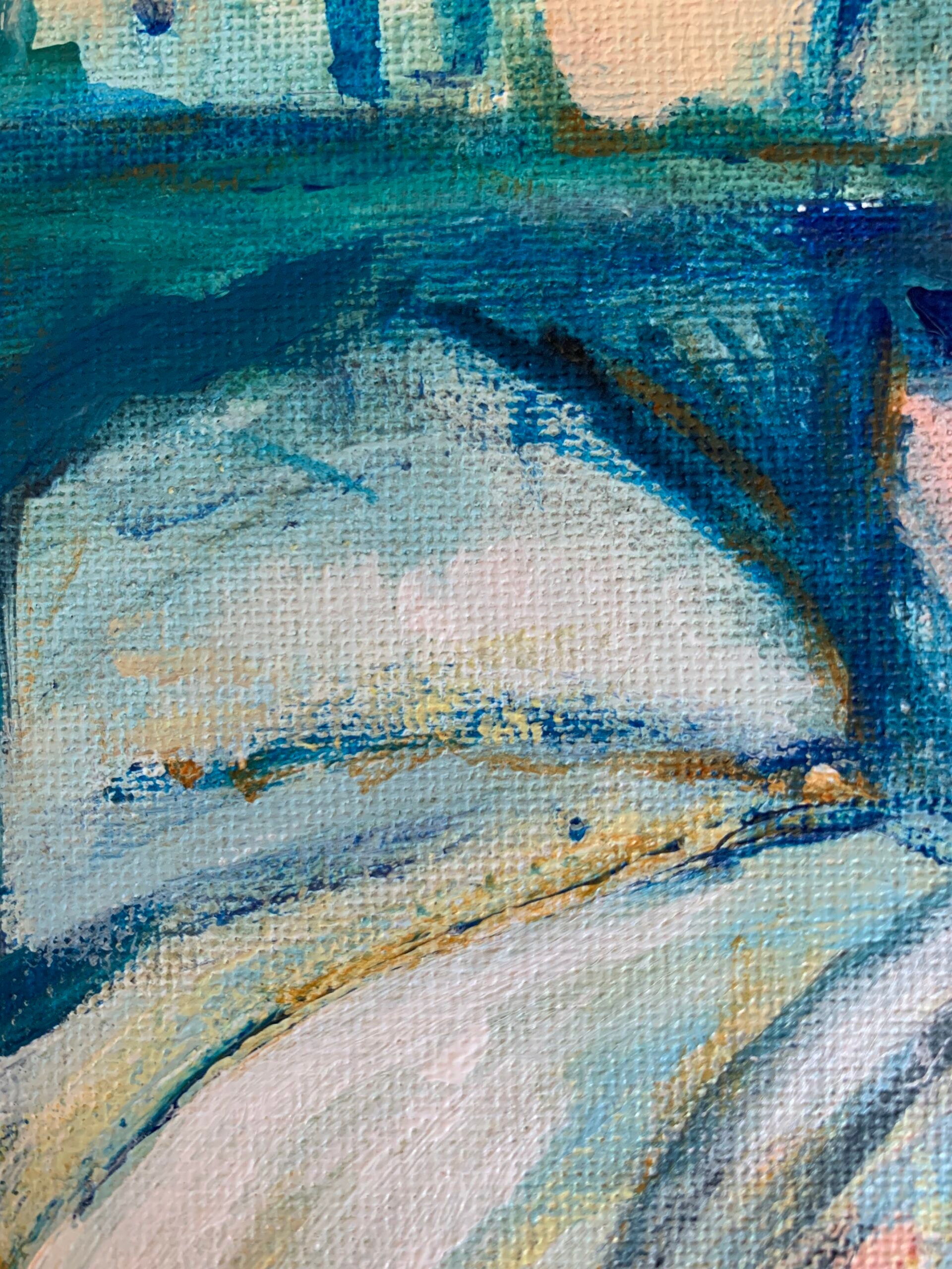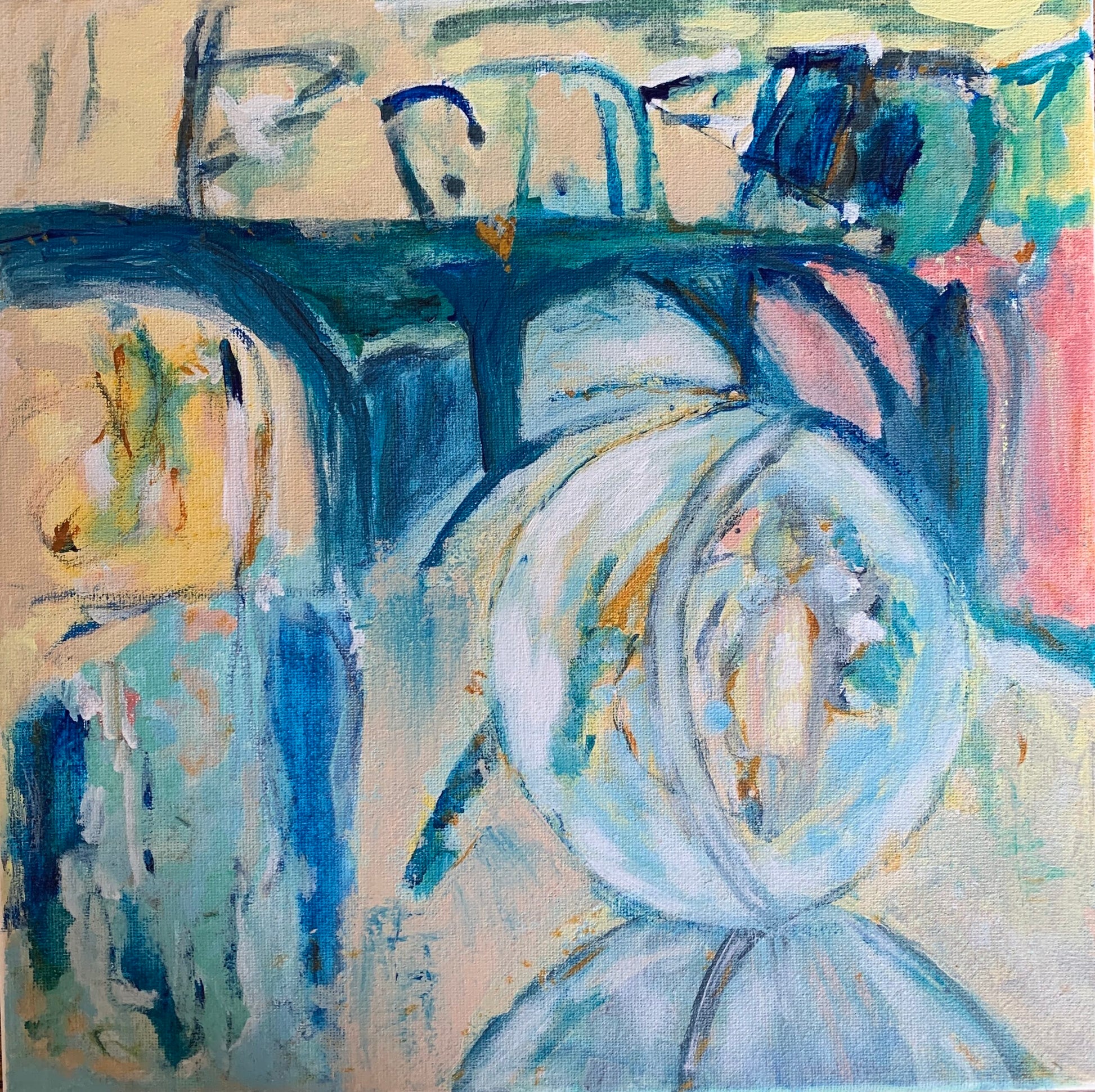 • Square abstract expressionist acrylic painting in deep blue, sky blue, deep turquoise, light gold, beige, dusty pink, yellow, light green and white against a soft dusty pink-parchment background.