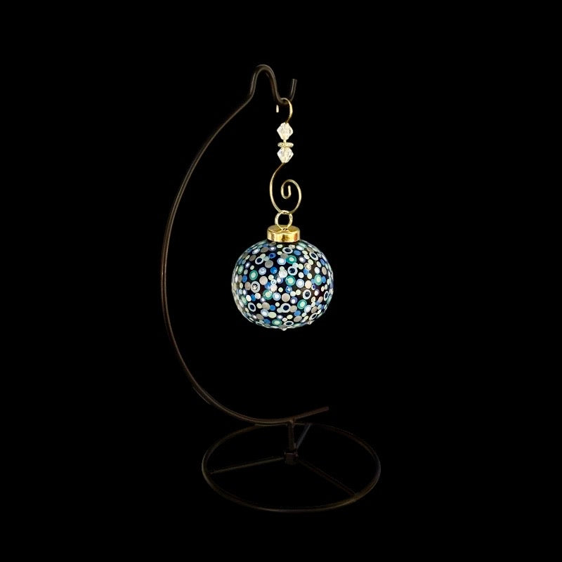 Bubble Pop is a hand dot-painted round ornament with a black base and accents of blue, teal, white, Its cheerful and sparkly clusters of dots float like bubbles in motion, adding a playful, lighthearted charm to any space.