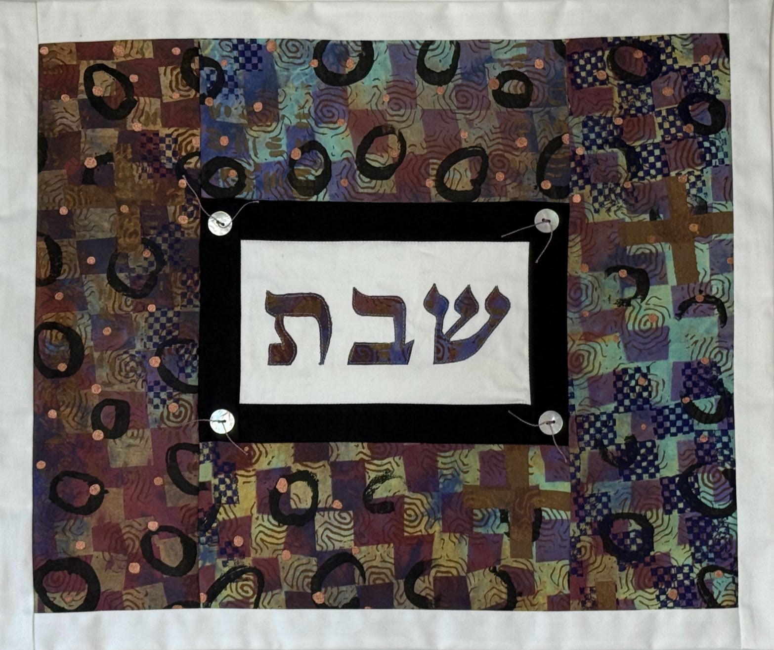 • Hand-printed cotton fabric appliqued with "SHABBAT" in Hebrew letters