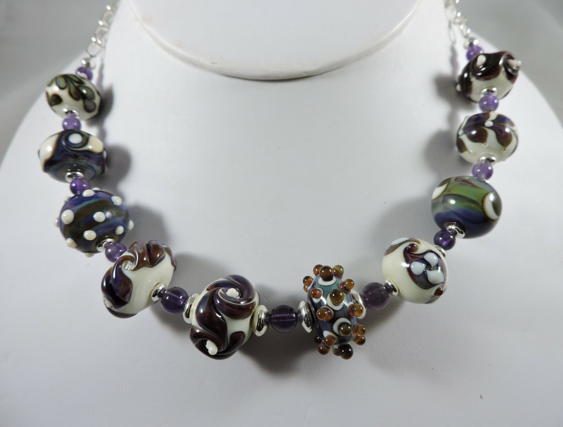 One of a kind necklace made of handmade glass beads adorned with sterling silver and amethyst. The beads are formed by melting glass over a torch in a process called lampworking. Each one is unique and made with a special silver-infused glass that allows for a wide range of color from the same rod. There are dots, leaves, swirls, flowers, even a moon bead.