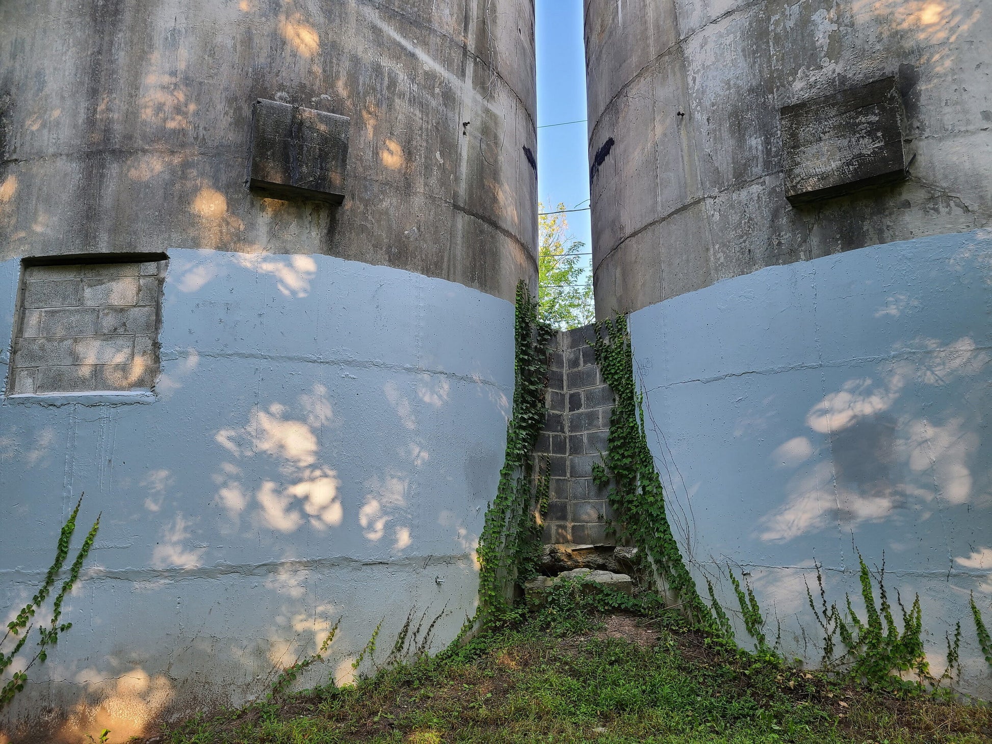 Storage towers in Cottekill. Light and shadows produce clouds on the painted sky.