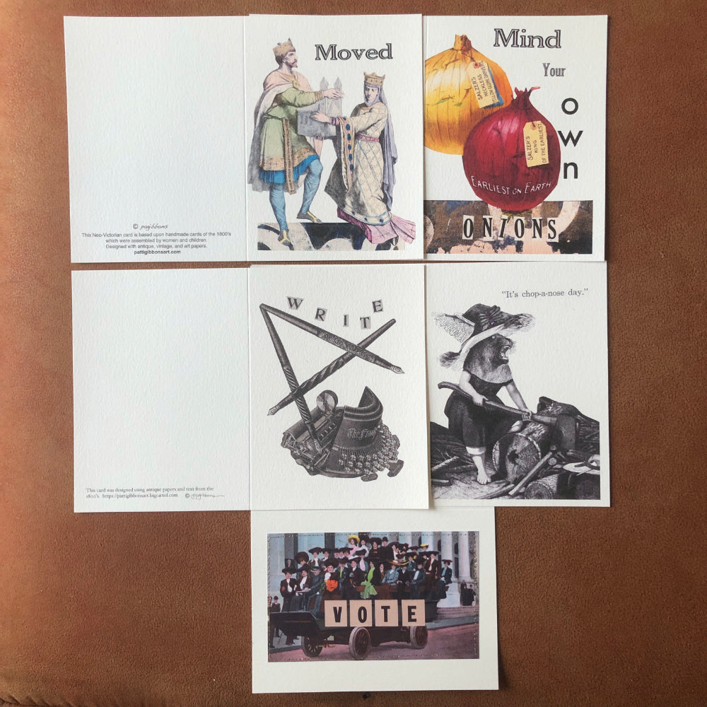 Little stories about the cards: they were all designed with antique paper, scanned, and then printed on 5" x 7" heavy Strathmore watercolor greeting cards. Vote: well, need I say more. Mind Your Own Onions was a phrase my mom used. Moved could have so many narratives to go along with it. Write is just that. We need to write more! And Chop -A-Nose Day (aka "Careful with that Axe Eugenia") could be used for any number of reasons.