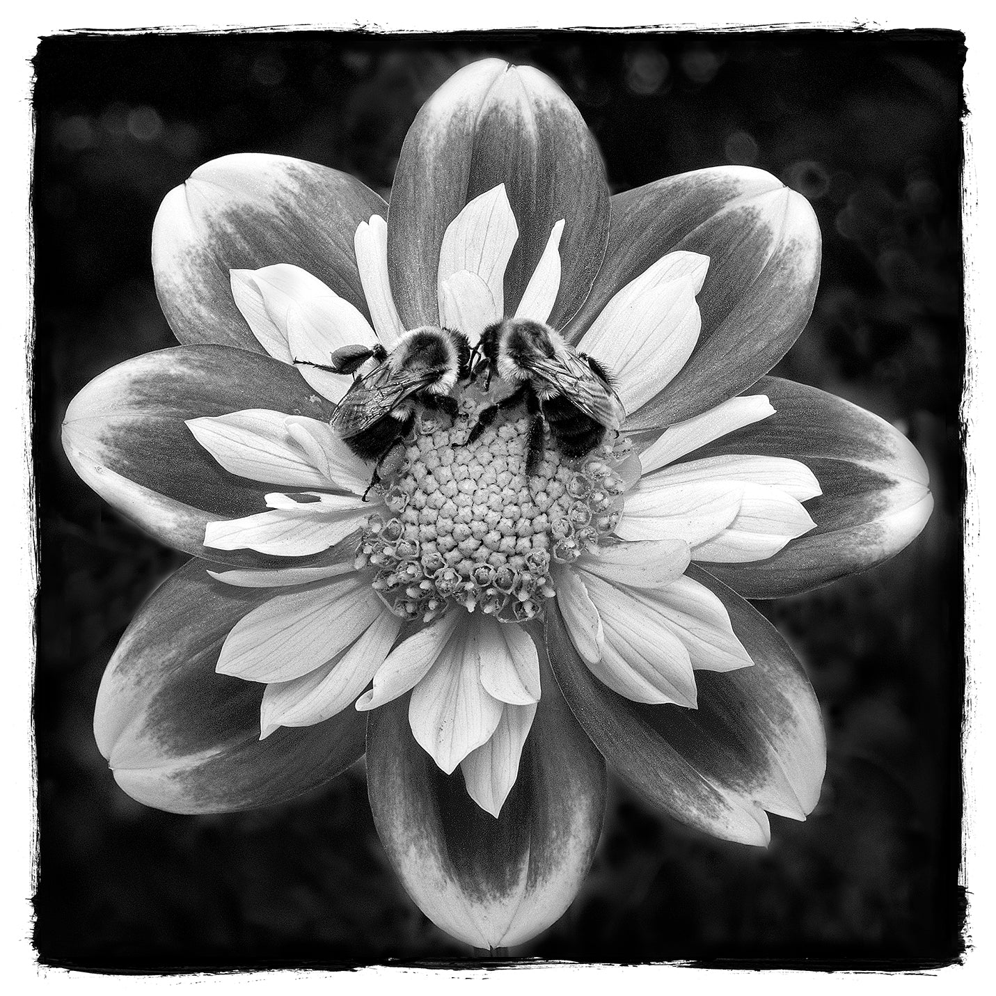 I captured these two bees in a serendipitous meeting when I was photographic a beautiful yellow and red dahlia.