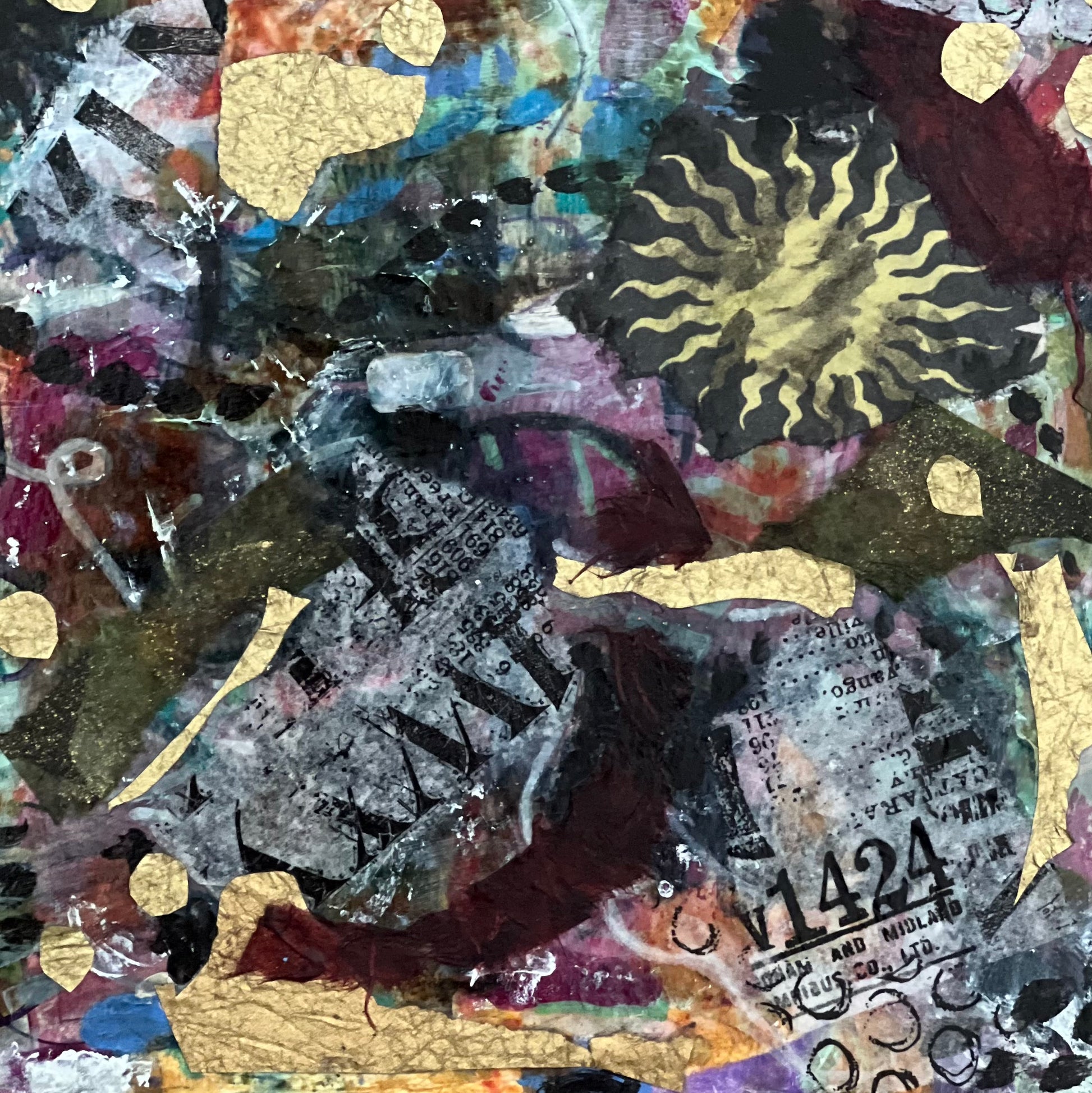 My abstract, mixed media paintings begin with value studies in paint, adding multiple shapes and lines drawn with a soft pencil. More layers are created using papers, fabric, numbers or letters as well as painted images from stencils. This is finished by more acrylic paint and colored pencils. I’m not thinking about a topic, just letting my work flow with the multiple layers. The skill is to know when to stop!