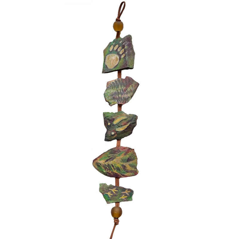 This is a hanging sculpture in which the physical form of the shale works with the visual forms derived from forest observations. These relief sculptures came into being as a way to work with forms from nature and emerge from the straight edges of the canvas. This piece is designed to be light and easy to hang, and is well suited for smaller spaces individually or larger spaces as a group.