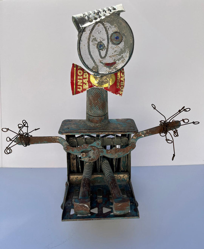 An old broken toaster forms the body of Dapper Dan. Large bolts represent his legs sitting in the open toaster. A grater forms his neck and a strainer/sifter represents the head. Some type of mechanical mechanism is used to make the arms with twisted wire pieces for hands. A shiny red piece of tin with text has been crafted into a bowtie. A cap has been cut from a fireplace screen. The rest of the piece is dull metal with some blue rubbed off paint.