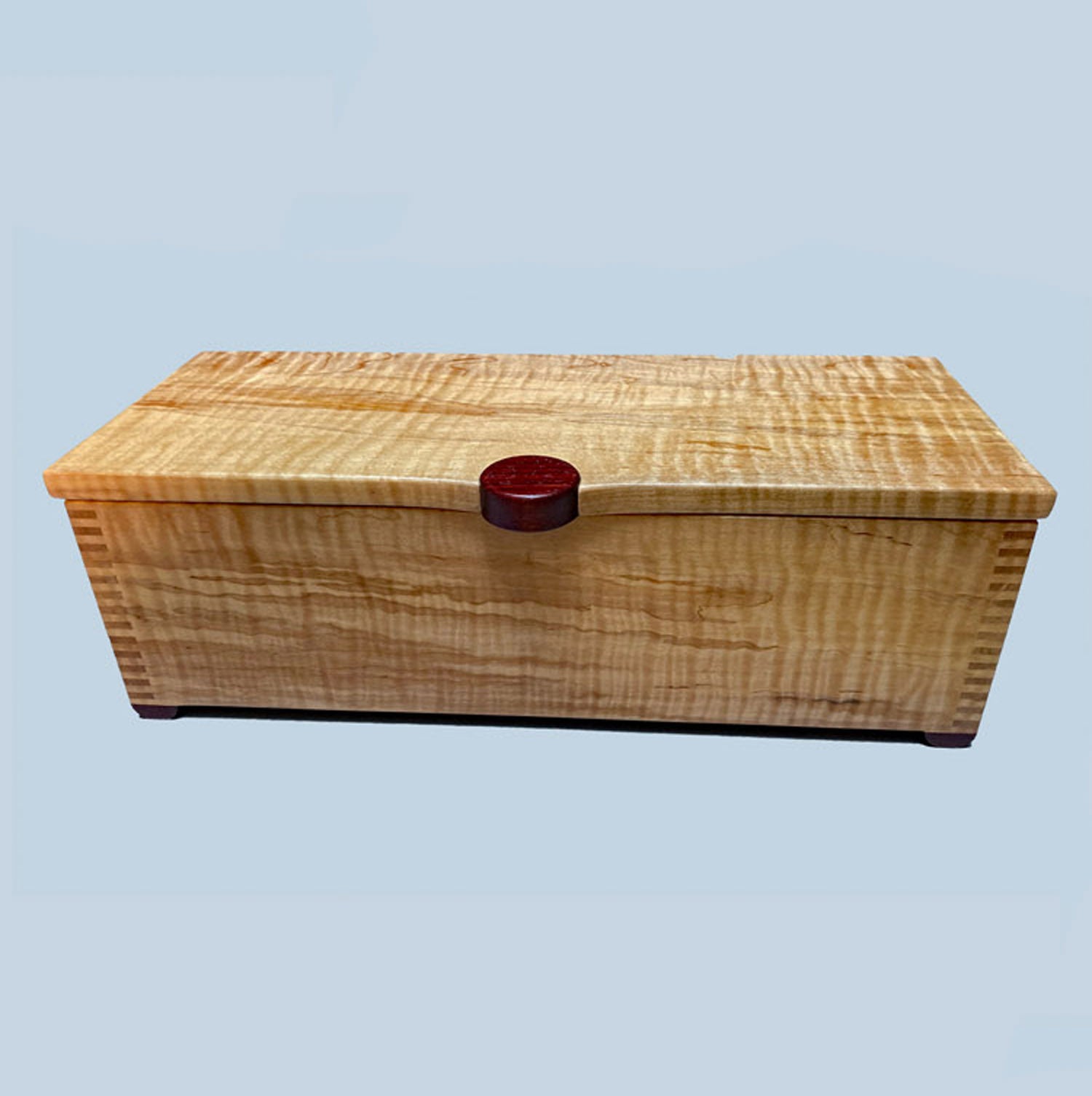 I call this “Dayglow” because the grain and colors seem to shimmer. This gorgeous curly spalted maple box is an elegant repository to hold watches, bracelets, or an array of other special treasures. I cut all four sides of the box in sequence from the same plank, and thus the grain pattern follows around from surface to surface. The lid's knob, which is inset into the swept shape of the lid front, is made of purpleheart, a naturally purple species. Purpleheart feet also grace this box.