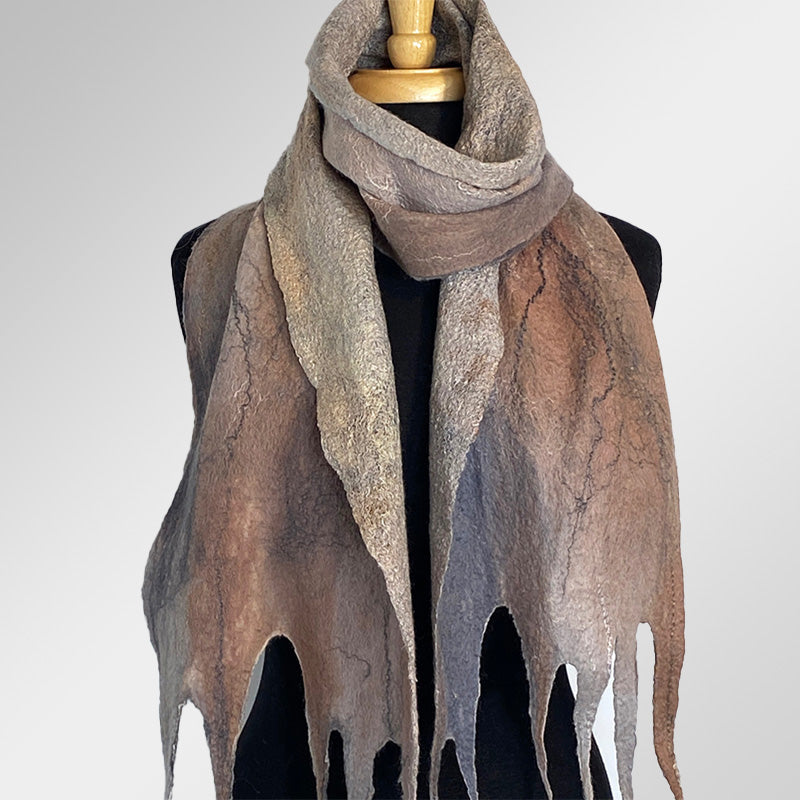 A felted 2 sided scarf with long irregular ends. One side has variegated vertical bands of soft ombre colors, the other is a lustrous blend of off white. It has a heavier weight that is perfect for cooler weather.
