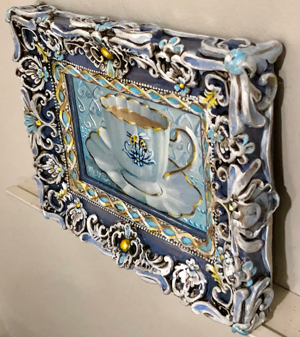 • The frame is upcycled, refinished and custom painted in layers of acrylic glazes to perfectly enhance the image