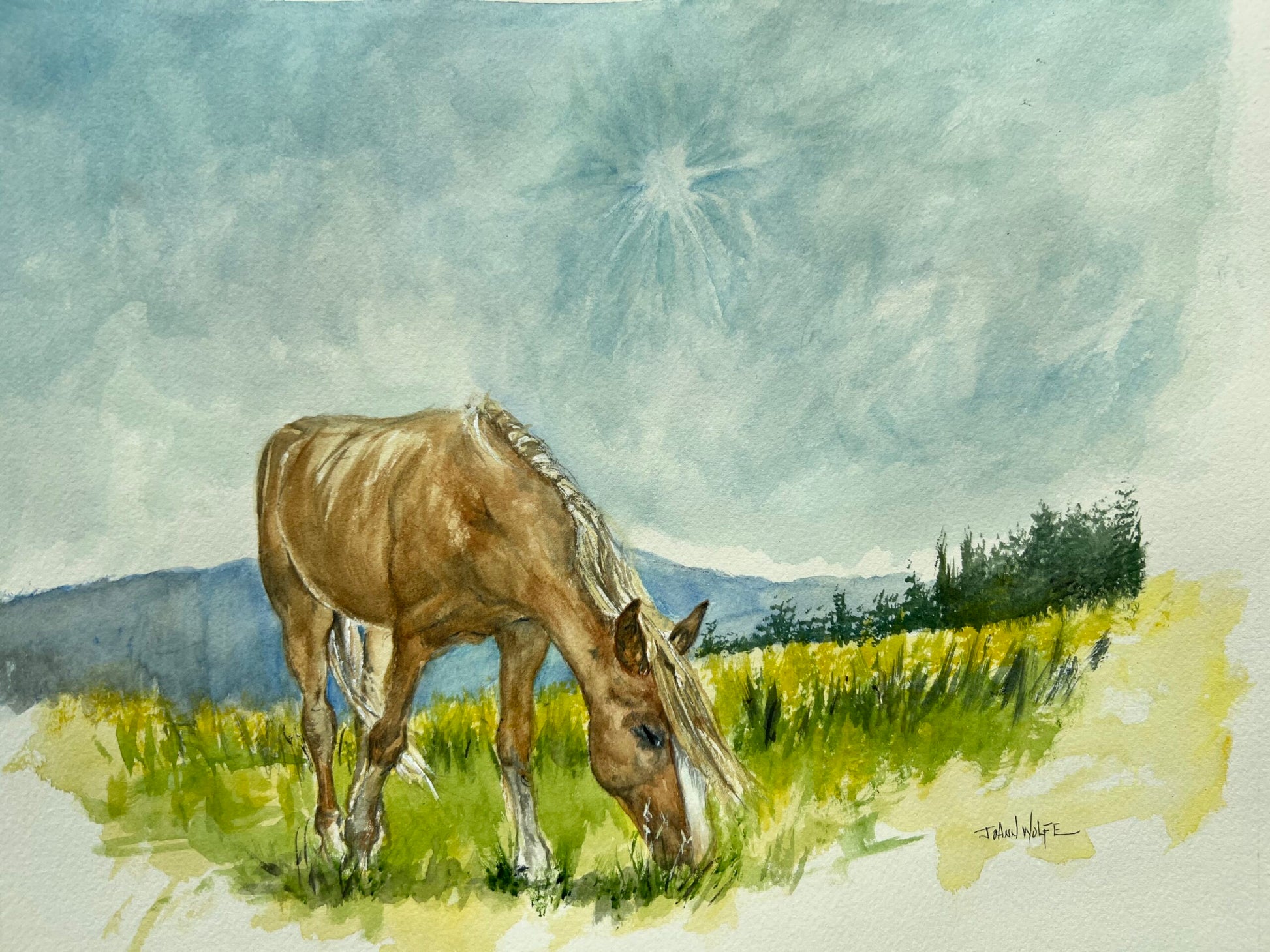 • 11" x 14" watercolor matted to 16" x 20" of a horse grazing in the field
