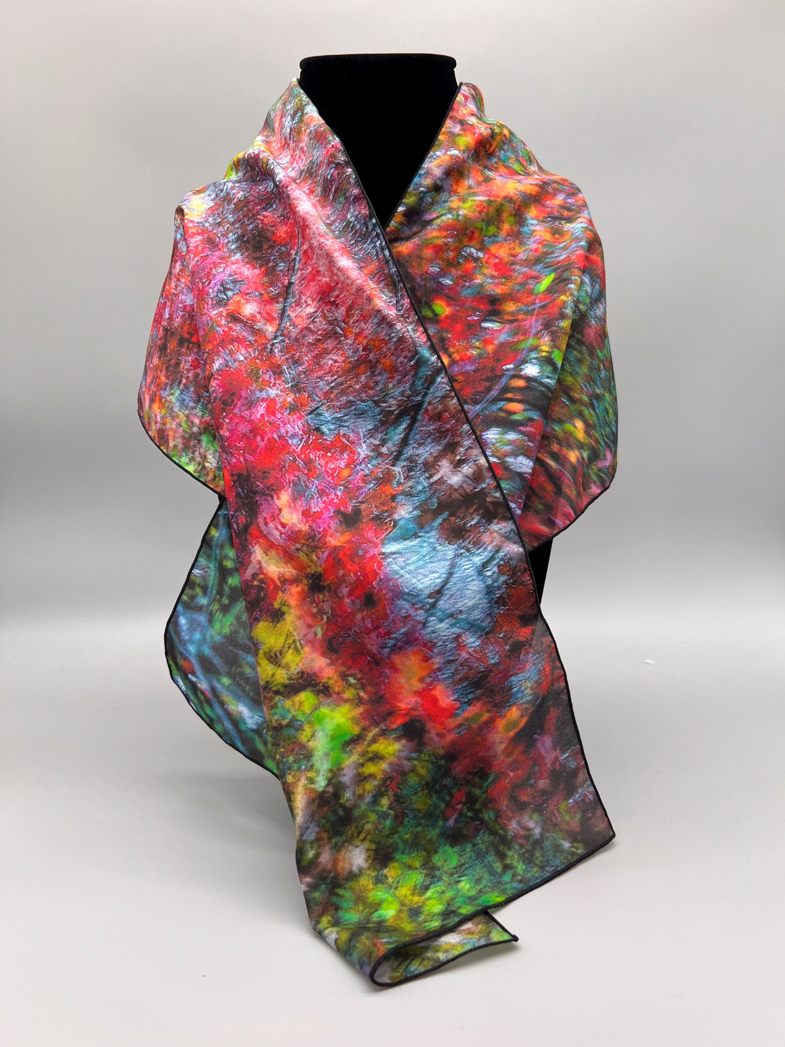 Scarf made from 100% silk habotai and finished with a machine rolled baby hem.