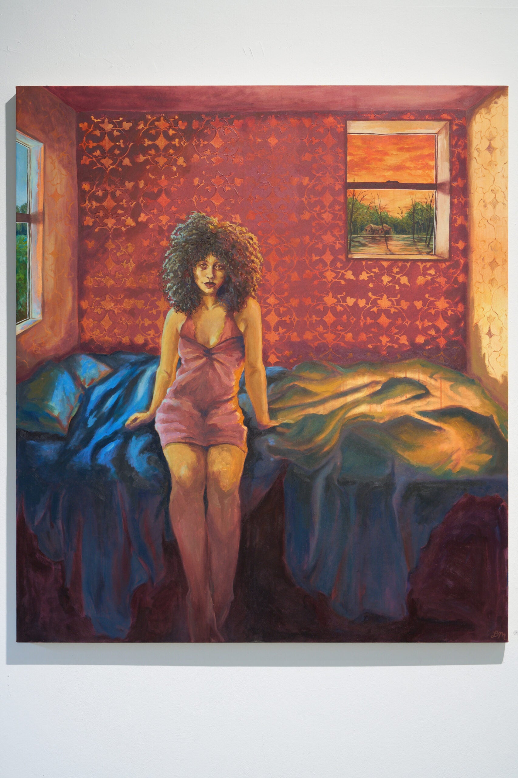 This piece took a long time to work on- it consists of many colors and methods used to achieve this dramatic scene of two worlds combined. This work depicts the anxieties of how climate change may affect the future, but also contentment with the present. When looking out of these windows two different worlds are seen, and whether they are the past, the present, the future, or a dream state is up to the viewer.