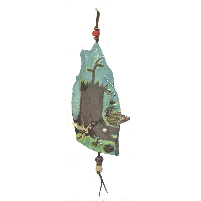 This is a lightweight hanging sculpture in which the physical form of the shale works with the visual forms from forest observations. The found objects illicit memories. These relief sculptures came into being as a way to work with forms from nature and emerge from the straight edges of the canvas. This piece is designed to be light and easy to hang, and is well suited to smaller spaces individually or larger spaces as a group.