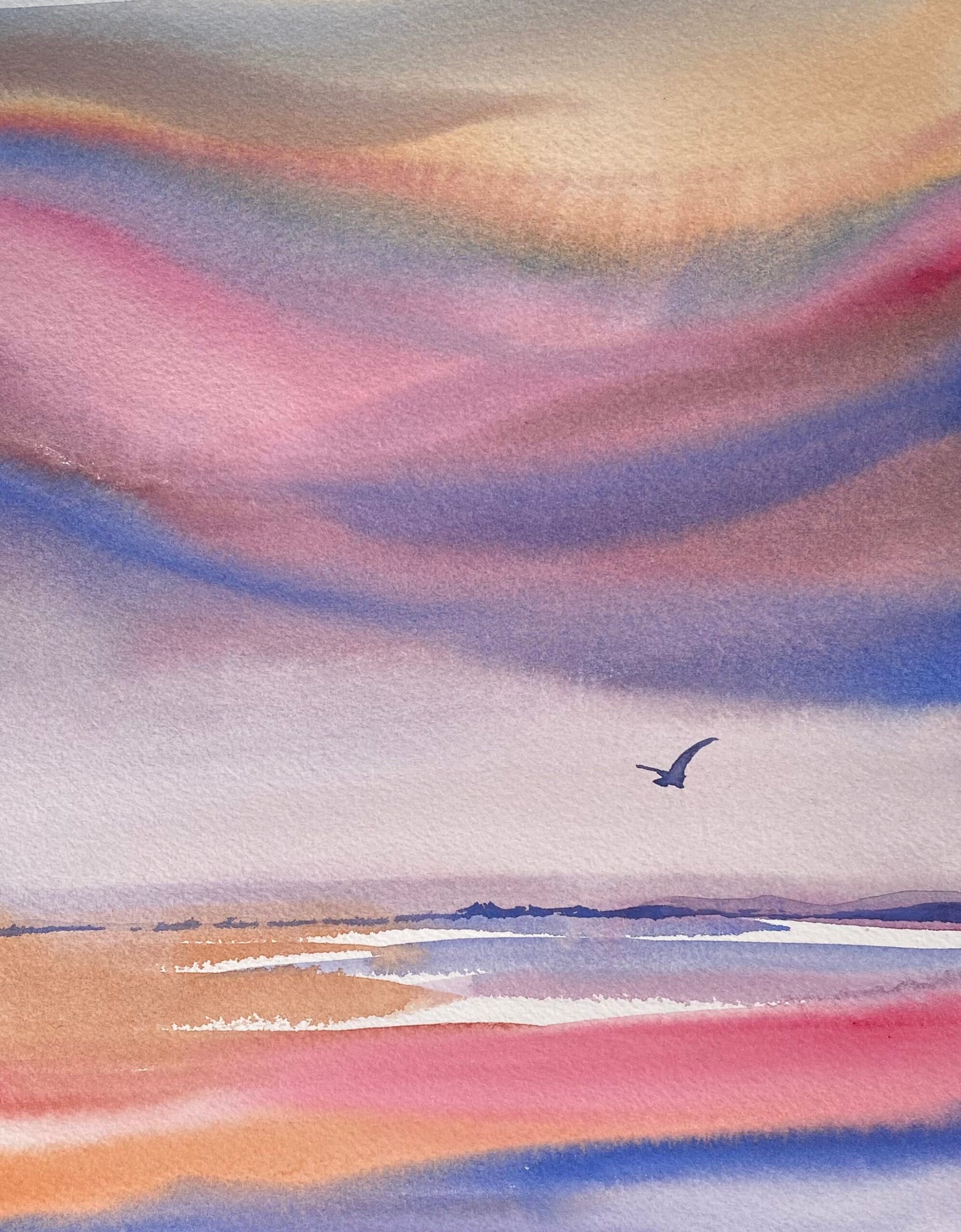 Freedom: the power to act as one wants without hindrance or restraint. This bird gets it! And how lucky it is, to fly across the beautiful sky. This painting is loose and free and I had a lot of fun painting it. I love when the water just takes over.