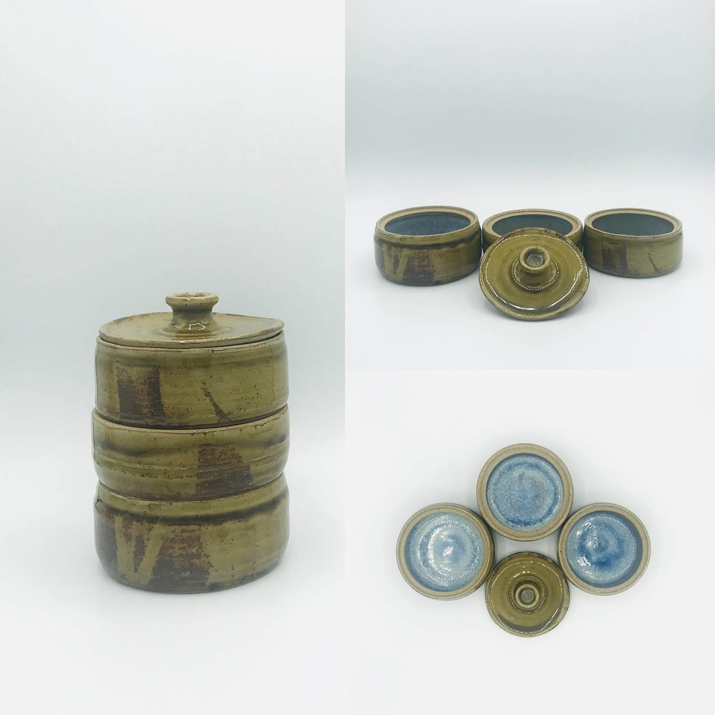 • 4-piece stacked jar made from an off-white, mid-fire stoneware (ceramic) with celadon glazes