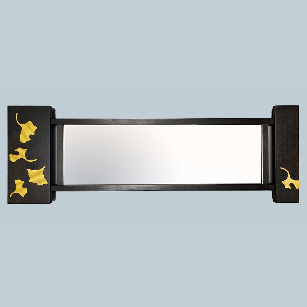 Elegantly shaped ginkgo leaves have graced art for thousands of years. The leaf shapes in my “Ginkgo Fall” art mirror echo yellow ginkgo leaves I once collected beneath a ginkgo tree. Made of yellowheart, a naturally yellow wood species, my falling fall ginkgos are partially recessed into ebonized walnut panels. Their slightly raised profiles add an extra dimension to this already multi-dimensional piece. The panels themselves are spaced apart from the ebonized walnut frame to allow part of the wall to show through. This design element adds to the sense of depth in this piece.