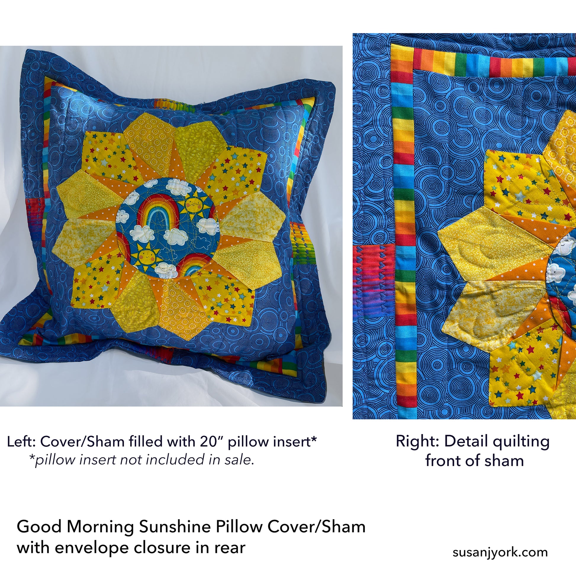 Thinking of a the innocence of childhood and its preservation, the artist created a pillow cover/sham taking the idea of positives of night and day to create this pillow sham and it’s companion piece Sweet Dreams under other listing. The cheerful sun is a modification on a classic Dresden .plate design selecting yellow fabric rays full of cheerful patterns including rainbow stars, with finished orange triangles between the blades to add dimensionality. These surround a cheerful smiling sun and rainbow sky appliquéd over the blades. The cheerful sun is bordered by a coordinating rainbow stripe and outer border of swirling blue sky interrupted by rainbow shafts all quilted together with decorative royal blue hearts embroidery to let the owner of this pillow know they are surrounded by love as they face the day ahead. The pillow front is quilted to a muslin back and the rear of the pillow cover is the same blue as the field with an envelope closure on the rear side. This pillow cover will be a great addition to any bed, especially that of a child, those young at heart or nursery, in a rocking chair or used as a floor cushion for tiny humans. The pillow is shown with a 20x20” pillow insert. The insert is not included in this sale.