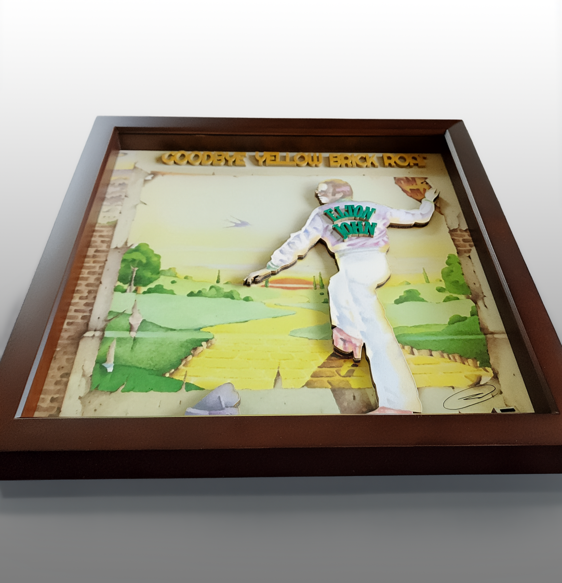 This 3-D Goodbye Yellow Brick Road album cover image is the 17-track album is often described as a career highlight and a "defining snapshot" of Elton John at the peak of his creative powers.