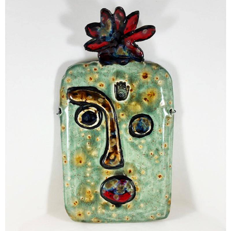 This whimsical character with a hamsa on his forehead and a big red flower adorning his crown is ready hang and cheer up any room.