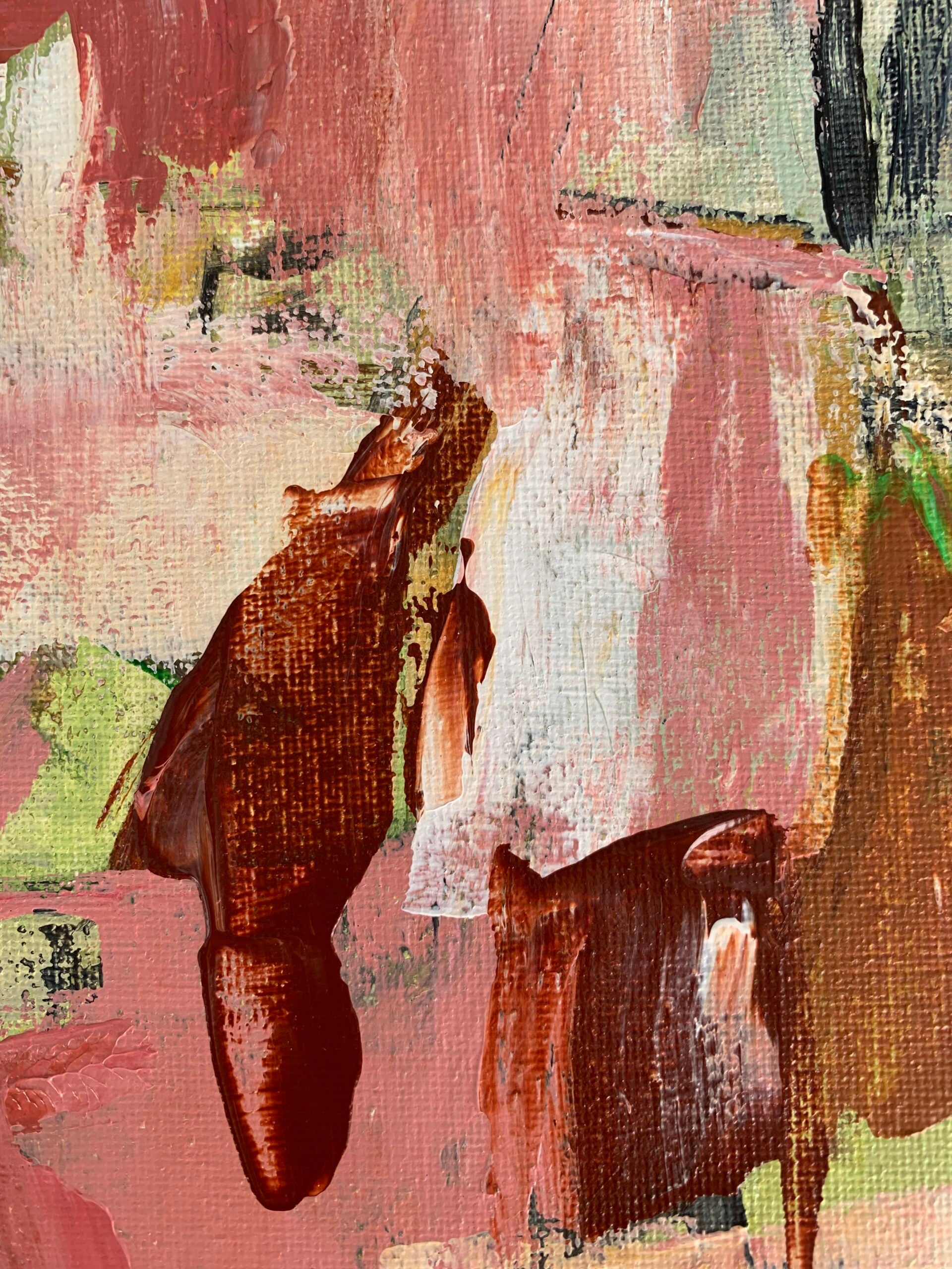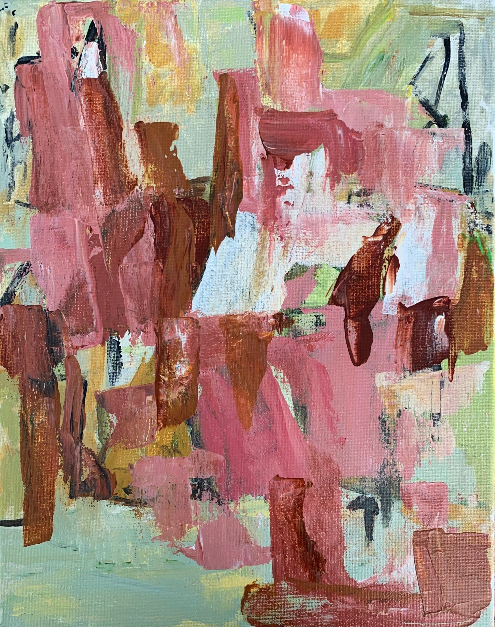 • Vertical abstract expressionist acrylic painting in rich brown, dusty pink, golden ochre, soft green, black, grey, pale yellow, and white against a creamy green background.