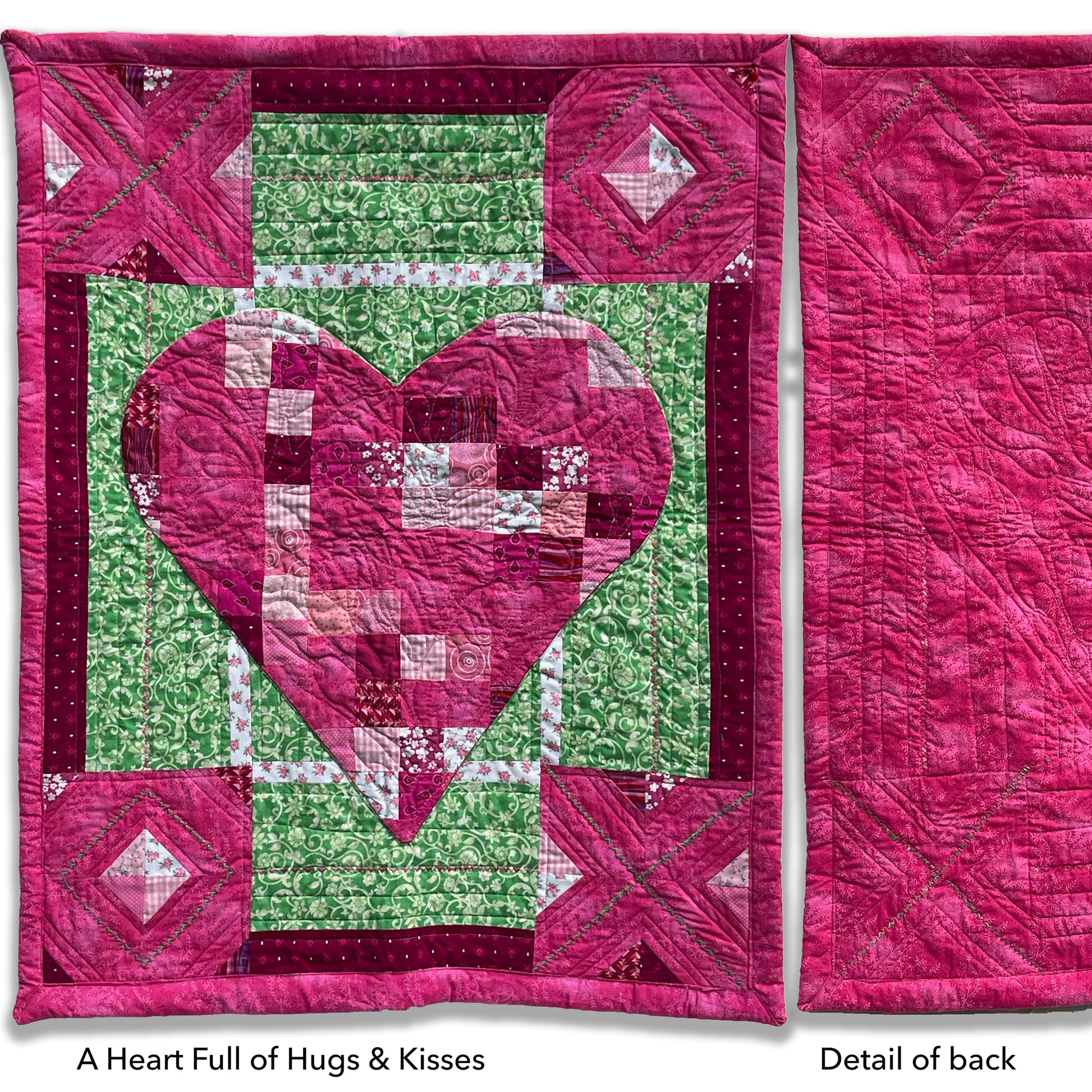 This small quilt may be used as a throw, a wall hanging or crib quilt. The pattern uses a combination of the traditional Hugs and Kisses pattern along with appliqué an strip quilting to create this unique crib. The large heart at the center is quilted with free motion quilting patterns. The appliquéd heart floats on a sea of floral green bordered by deep magenta and pink. The machine quilting in the field and frame includes straight stitches and rows of decorative embroidered hearts in contrasting colors. Pink on green and green on pink.This small quilt is backed and bound with a pink floral fabric.
