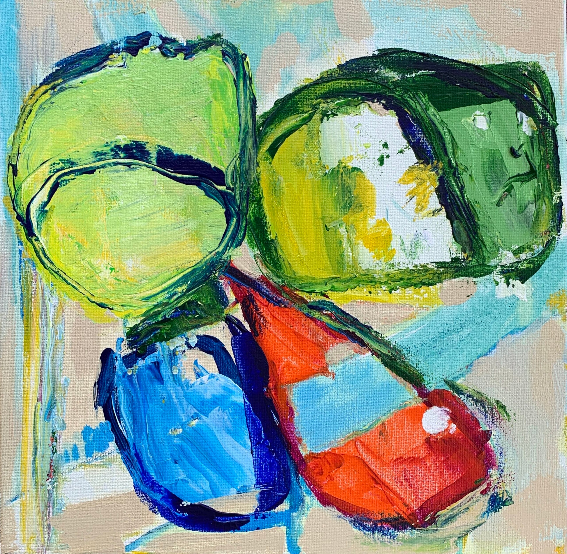 • Square, abstract expressionist acrylic painting in hunter green, lime, fiery orange, deep blue, sky blue, turquoise, warm yellow, fuchsia, white against a parchment background.