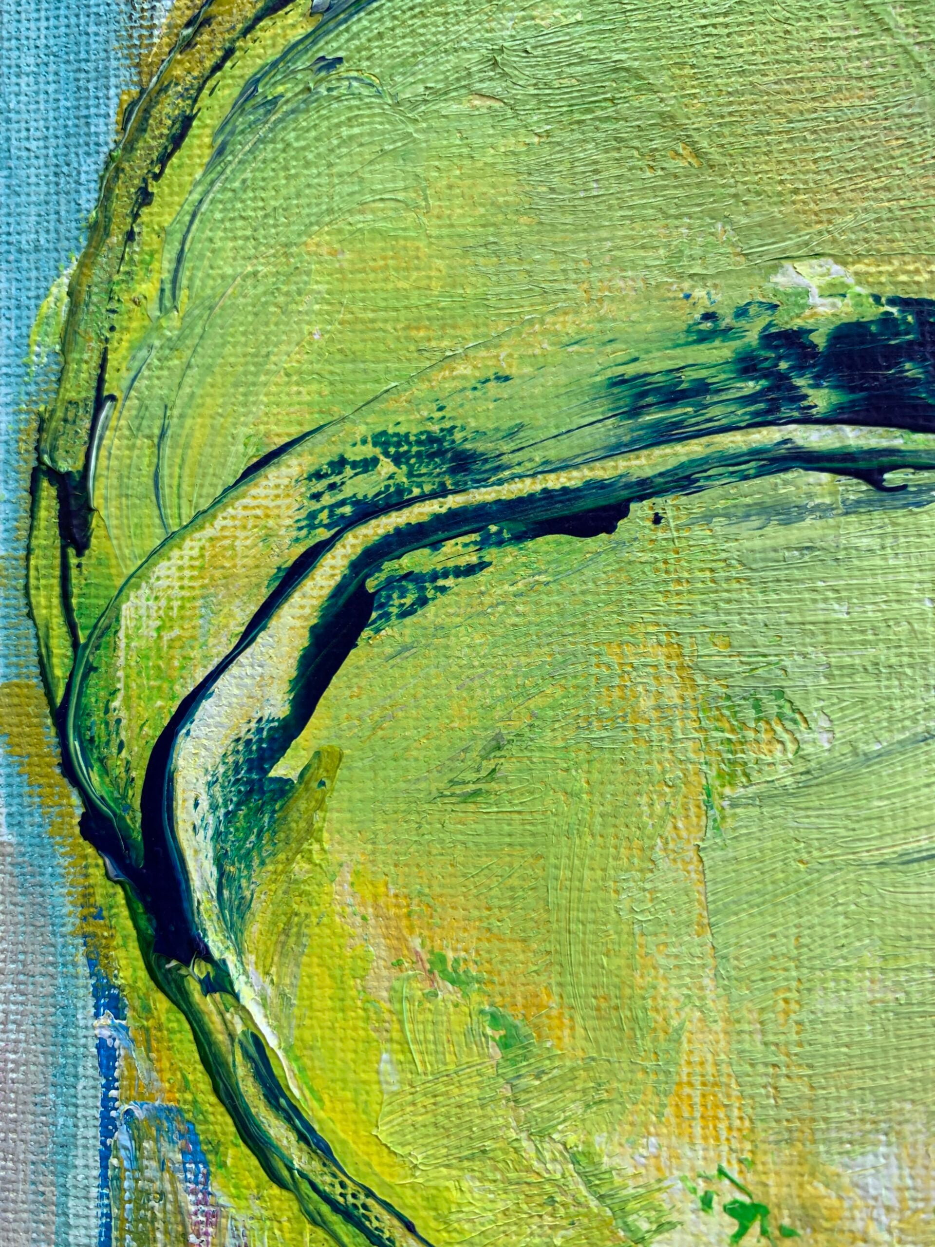 This square abstract expressionist acrylic painting with loose and gestural brushstrokes in vibrant tones of lime green, sky blue, and bright fiery orange. The bright shapes pop against a subtle pale parchment-blue background. Paint is applied with brushwork and palette knives in varying textures and lines. The painting is unframed, with white painted sides so framing is optional. The artist's signature is on the reverse. Contact Sharon Dee for commissions and inquiries at sharondee1@gmail.com
