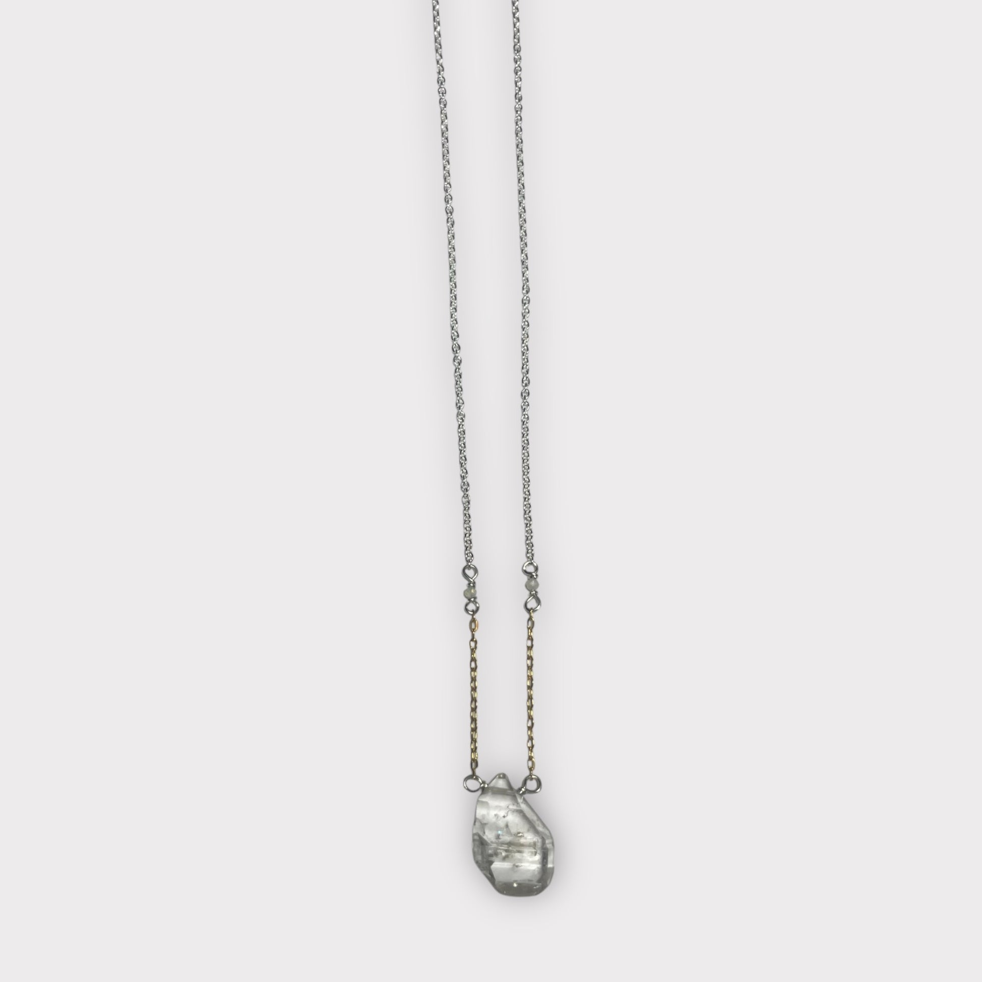 This delicate necklace is made from our own New York State stone the Herkimer diamond. It is technically crystal quartz, but it’s natural formation mimics a diamond. This necklace is made with sterling silver chain accented with 14 karat gold fill and two tiny Ethiopian opals. The customer can adjust the length from 16 to 18 inches.