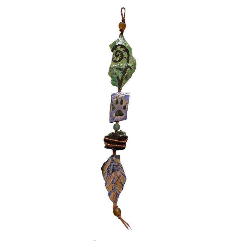 This is a light-weight hanging sculpture with fiddlehead fern for, paw print, feather and beads to illicit our place in the natural world contemplation and renewal. These relief sculptures came into being as a way to work with forms from nature and emerge from the straight edges of the canvas. This piece is designed to be light and easy to hang, and are well suited to smaller spaces individually or larger spaces as a group.