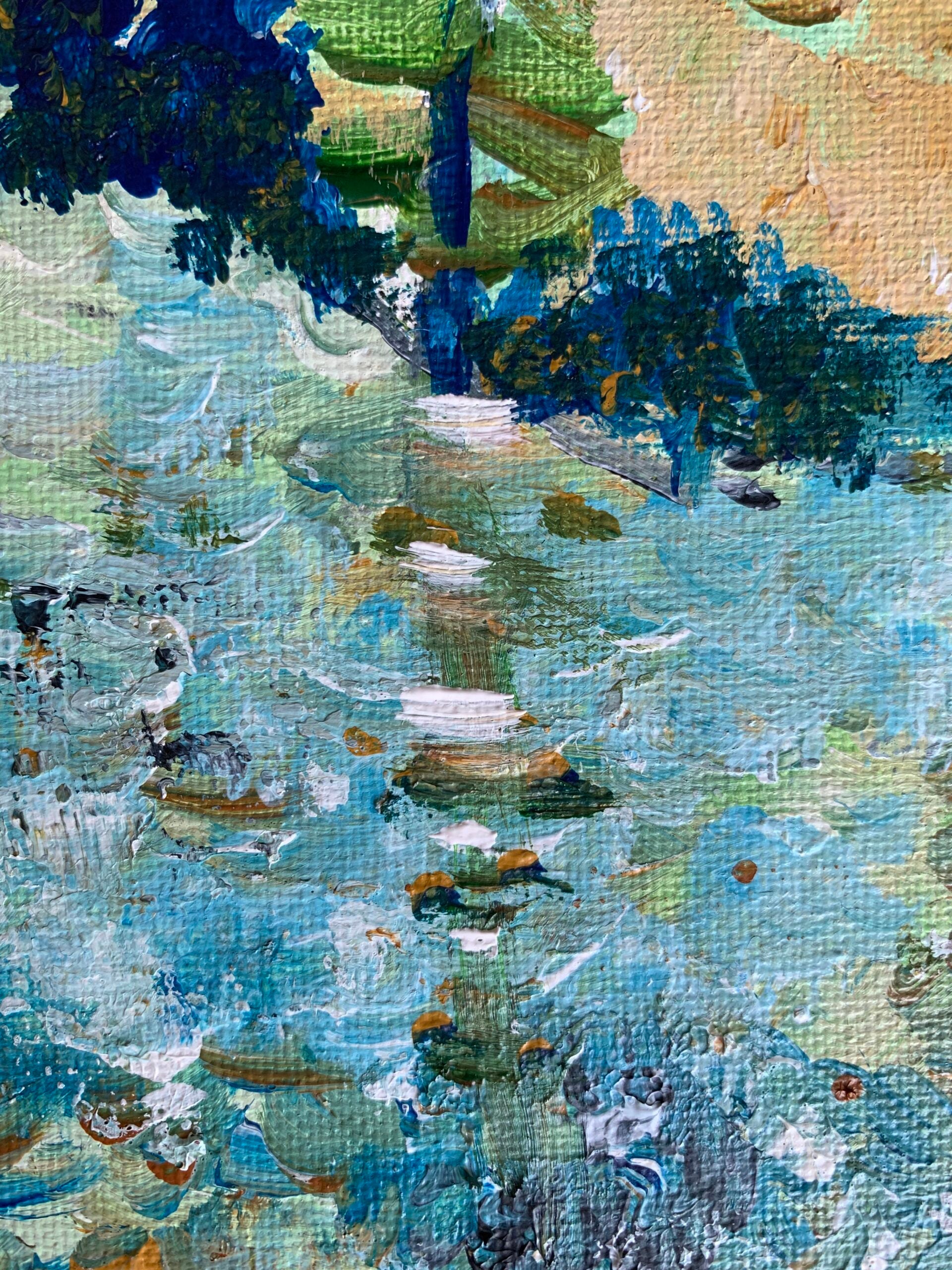 Paint is applied in bold tonal dabs with undertone markings slightly visible. Shapes are defined by varying brushstrokes to create a sweeping vista of detail within the painting. The painting is unframed, with white painted sides so framing is optional. The artist's signature is on the reverse. Contact Sharon Dee for commissions and inquiries at sharondee1@gmail.com