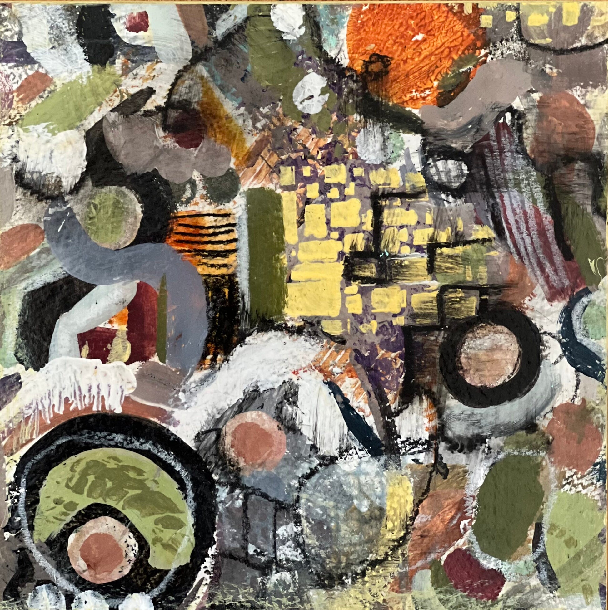 multiple shapes drawn with a soft crayon. More layers are created using papers, fabric, numbers or letters as well as painted images from stencils. This is finished by more paint and colored pencils.