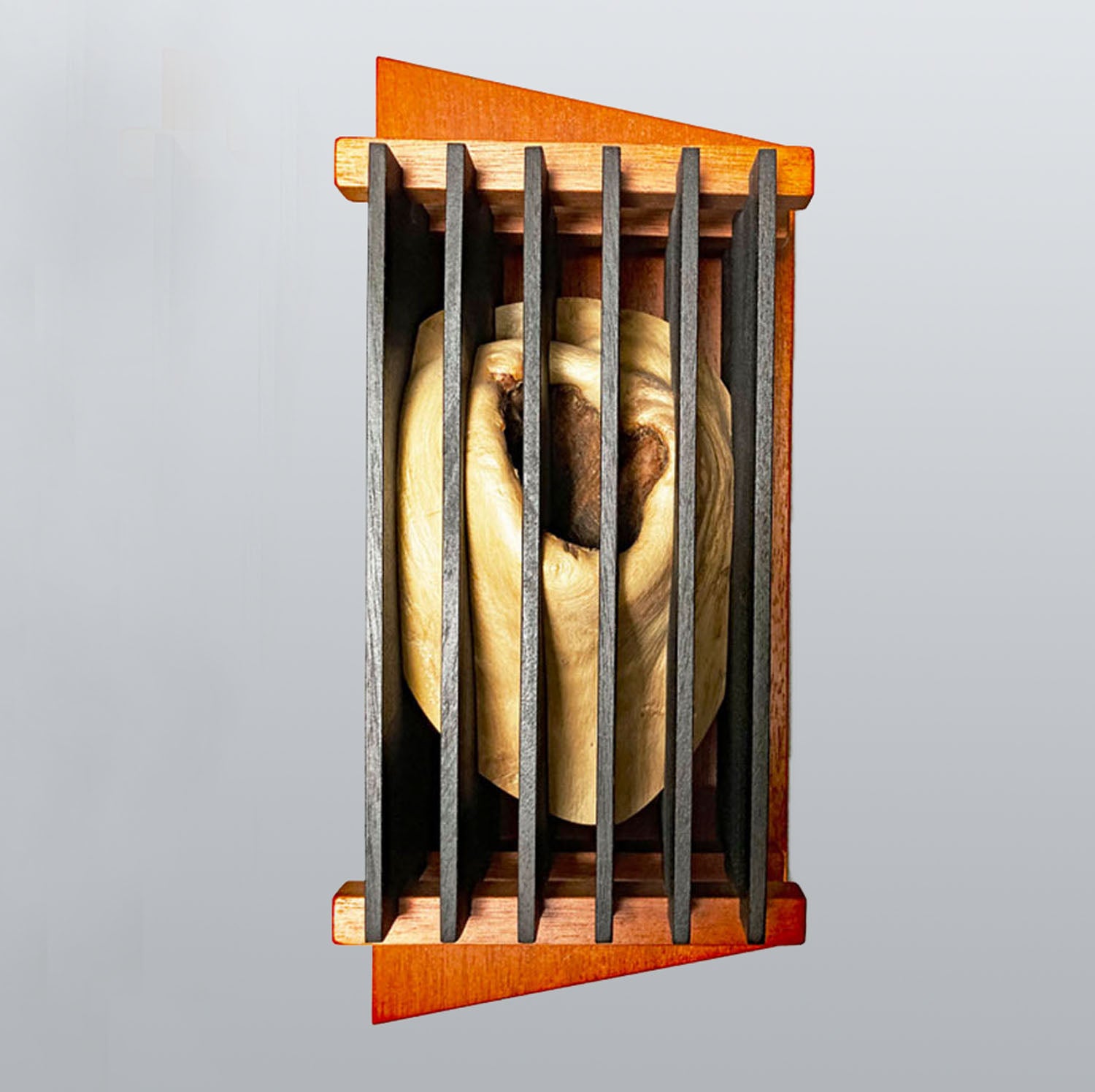 I sliced this very unusual birch knot vertically and then “incarcerated” it within dyed black mahogany panels. The panels are positioned in notched mahogany cross pieces. No screws or glue trap the knot segments--they're held in place simply by tension. A raised panel on the rear of the base makes my incarcerated knot appear to float on the wall. The panel has a sliding horizontal keyhole that makes for easy wall mounting.