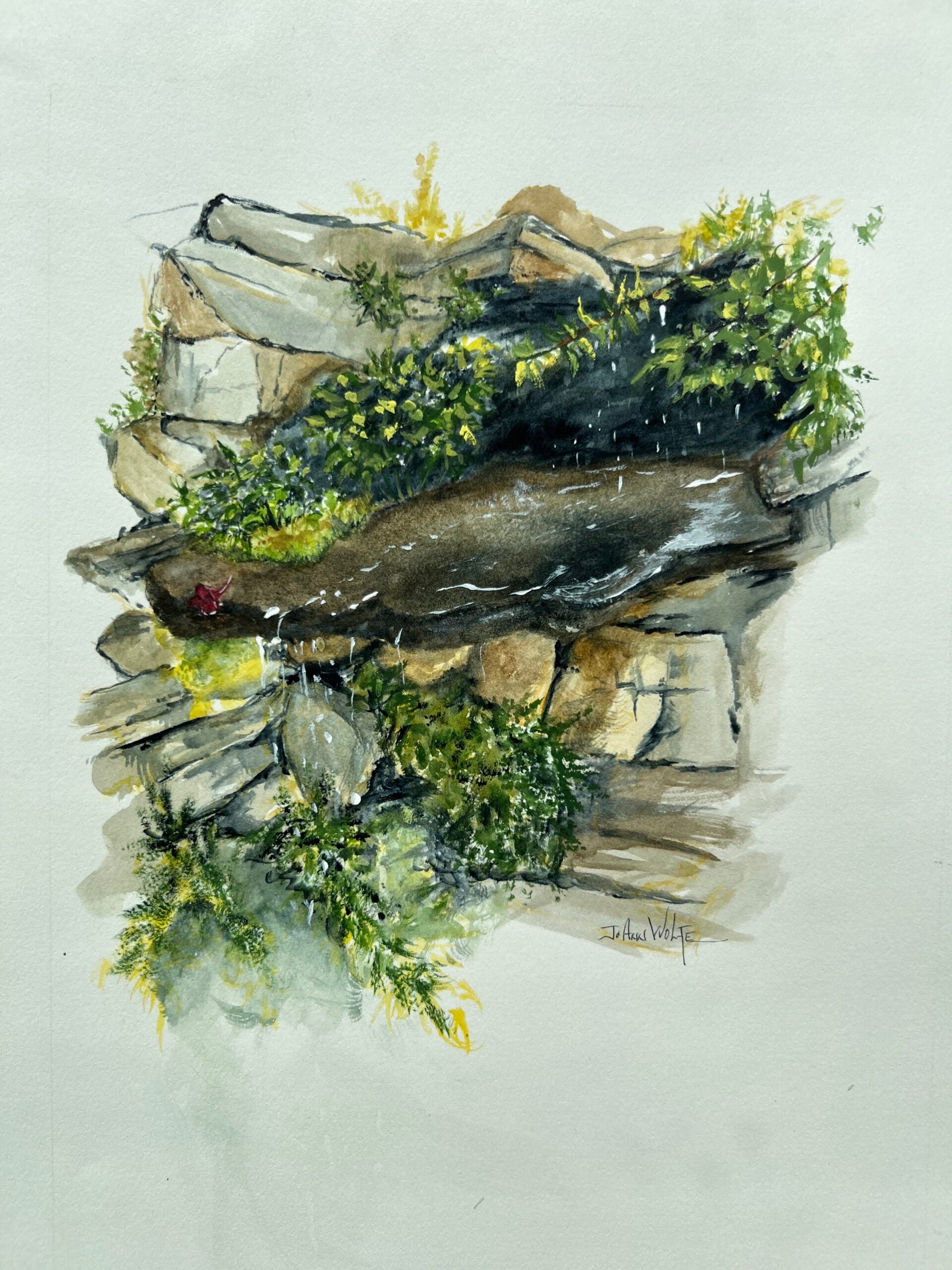 This painting captures a tranquil natural scene with a focus on stone, greenery, and the gentle flow of water. The central feature is a rocky ledge, painted in earthy grays and browns, its rugged texture softened by clusters of lush green plants and delicate touches of yellow blossoms that spill gracefully over the edges.