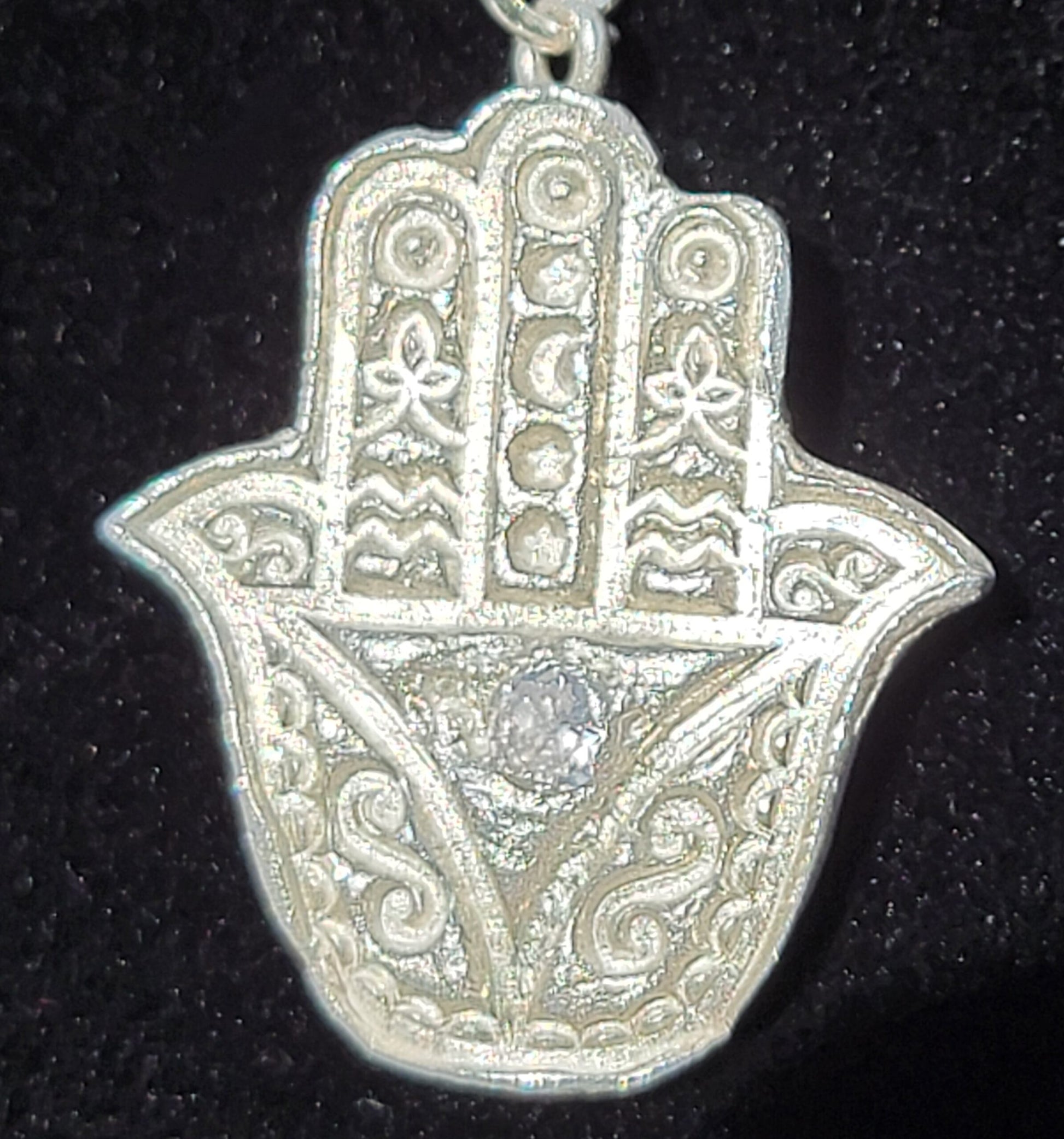 • Pure silver Hamza pendant with an intricate design embellished with a clear cubic zirconium stone