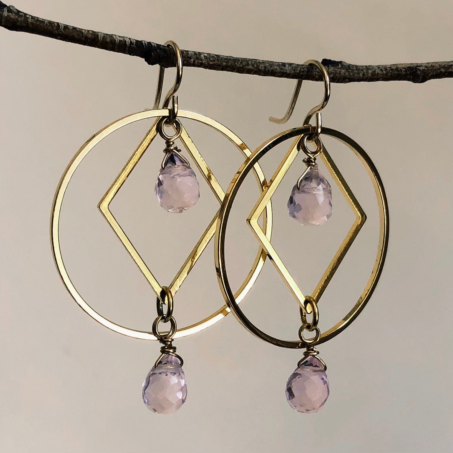 Faceted gemstones dance along with dangling golden diamonds and circles.