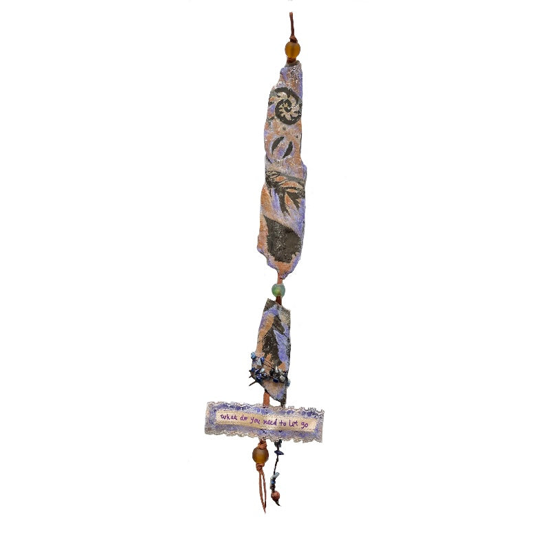 This is a light-weight hanging sculpture with silhouettes from the local natural environment and the written statement "what do you need to let go." This piece supports a meditation on being present. These relief sculptures came into being as a way to work with forms from nature and emerge from the straight edges of the canvas. This piece is designed to be light and easy to hang, and are well suited to smaller spaces individually or larger spaces as a group.