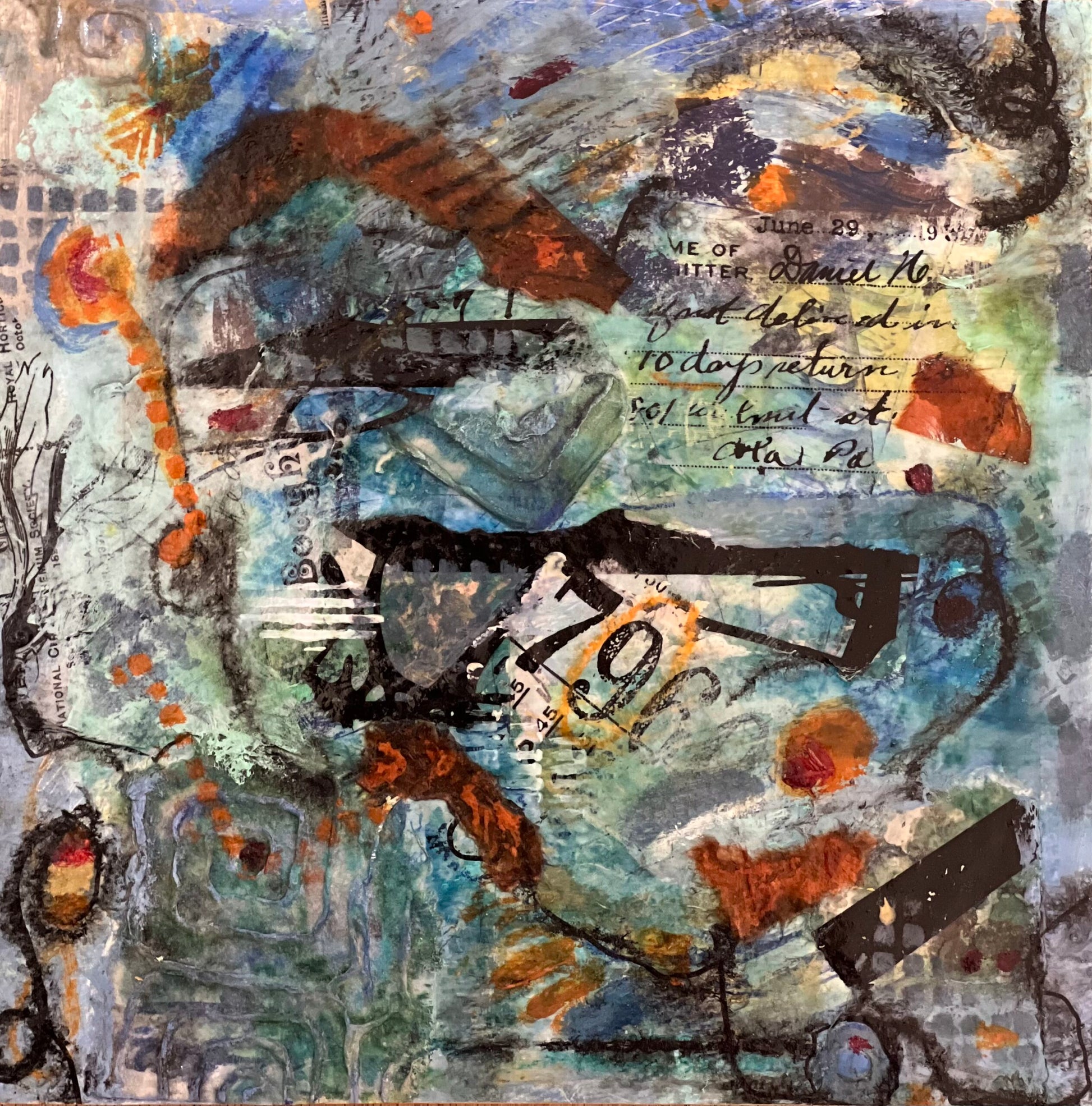 • Mixed media (acrylic paint, paper, fabric, colored pencils, inks) on paper mounted on 7/8” deep wood cradle board.