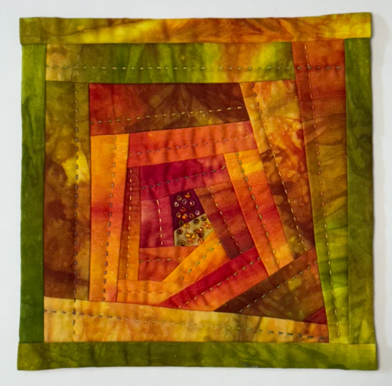 This play on a traditional 'Log Cabin' square turns the design on a tilt and jazzes it up with some beading. It is the perfect 'little something' you've been looking for to fill in the blank space on your wall.