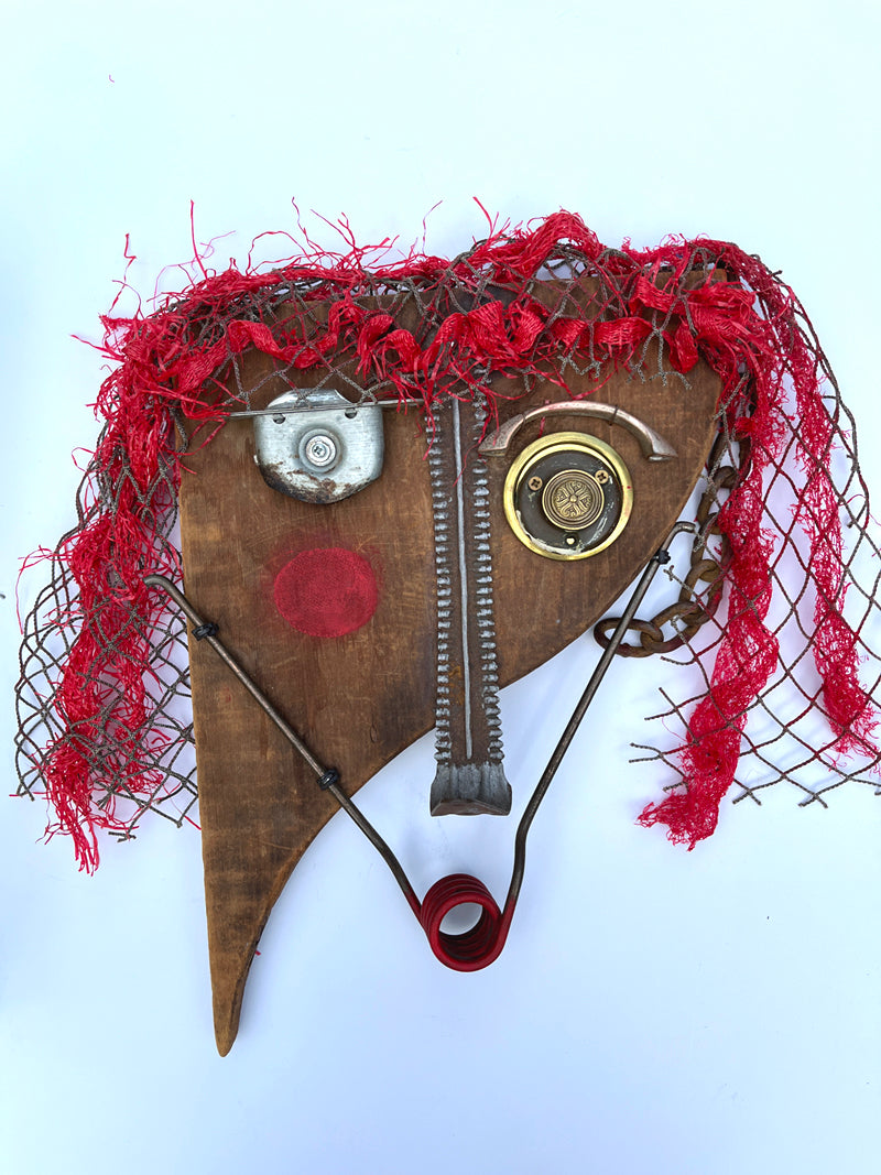 Lucy's head is a dark brown wood block found at a construction site. ... the mouth is a tension spring with added red paint...the nose is an angle iron ....one eye is a knob and a ring with a handle for an eyebrow. ...the other eye is an unknown type of metal casing. She has a rosy cheek. The hair is fish netting with red onion bag netting woven through it. On the top of the piece, a heavy chain hangs down on the right side of her face. I love Lucy!!!!!